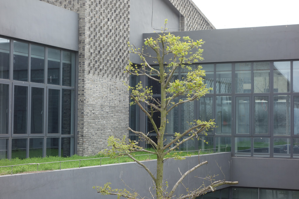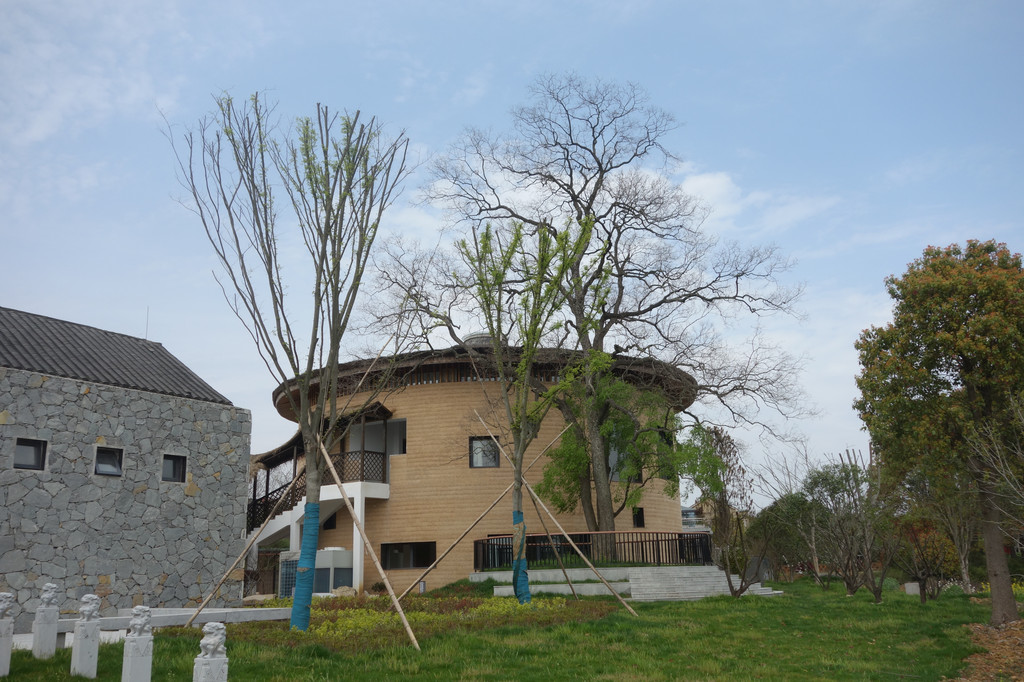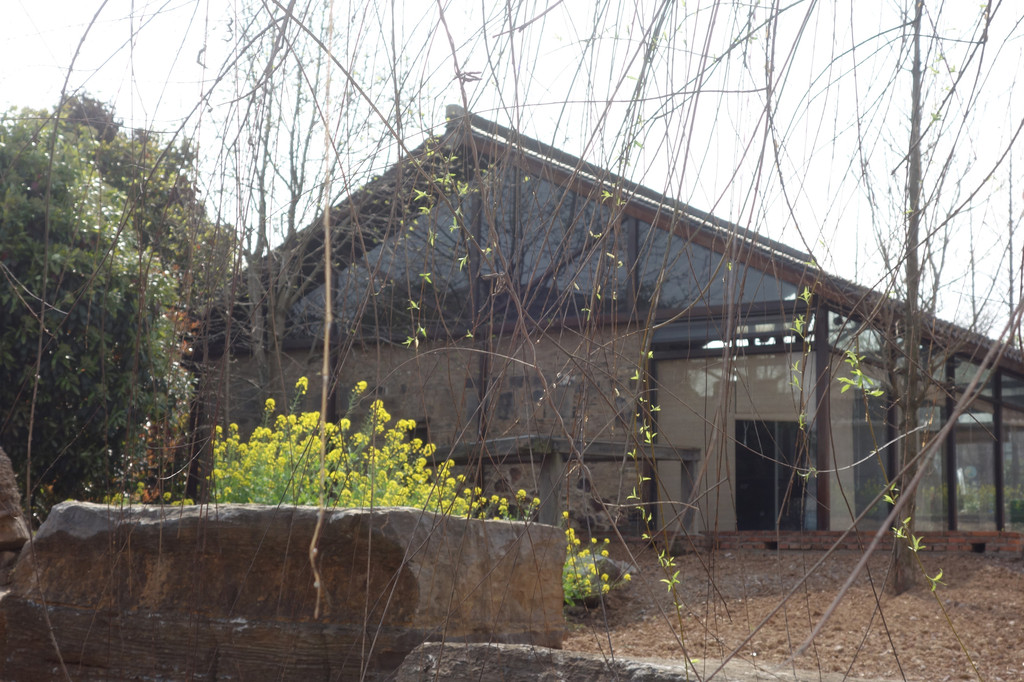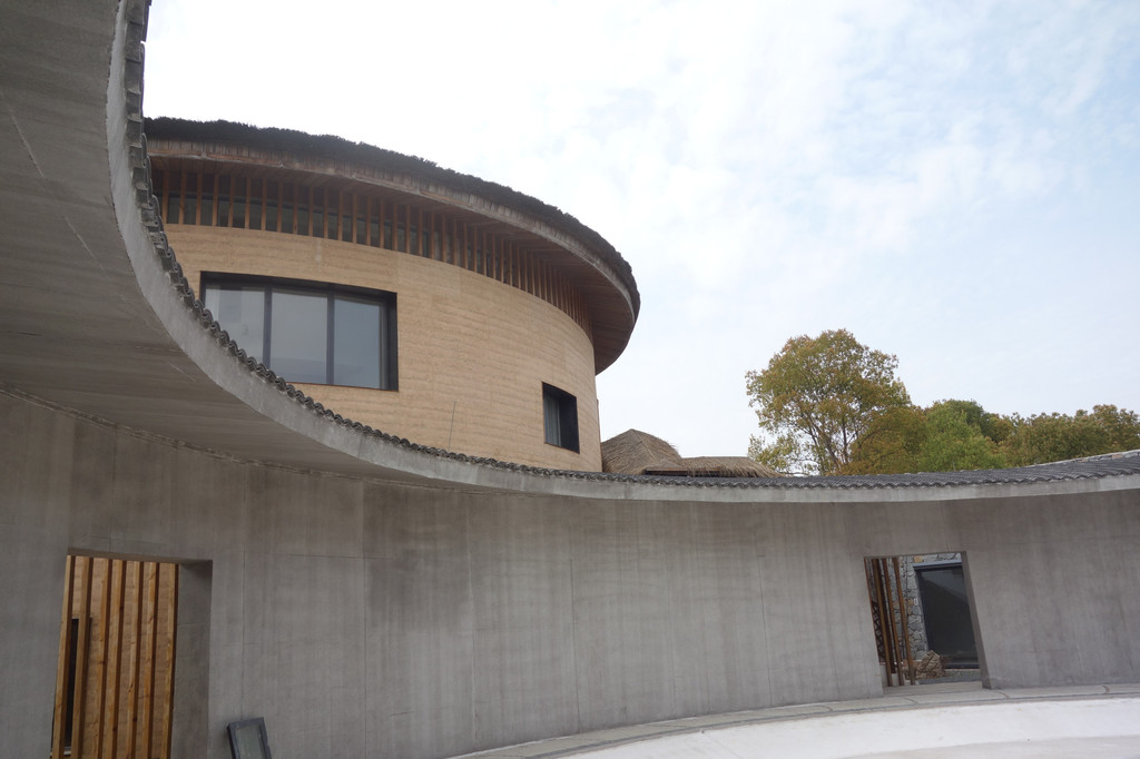 谷仓使用夯土墙体,木构架茅草覆顶。两个大大的谷仓中间透过一个“品”字型的玻璃连廊链接。