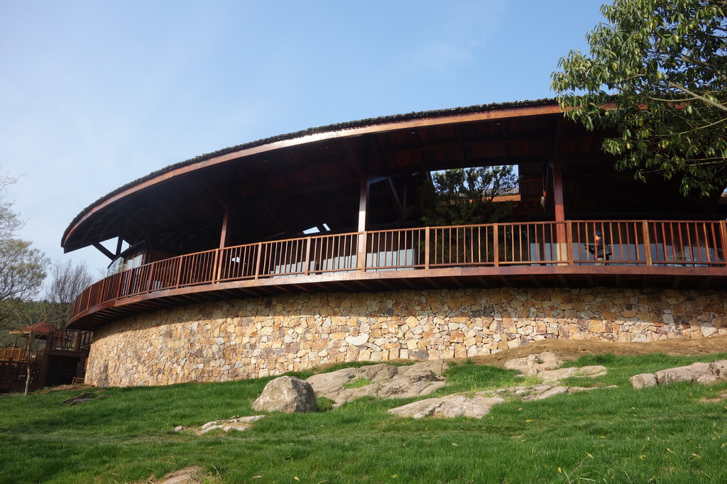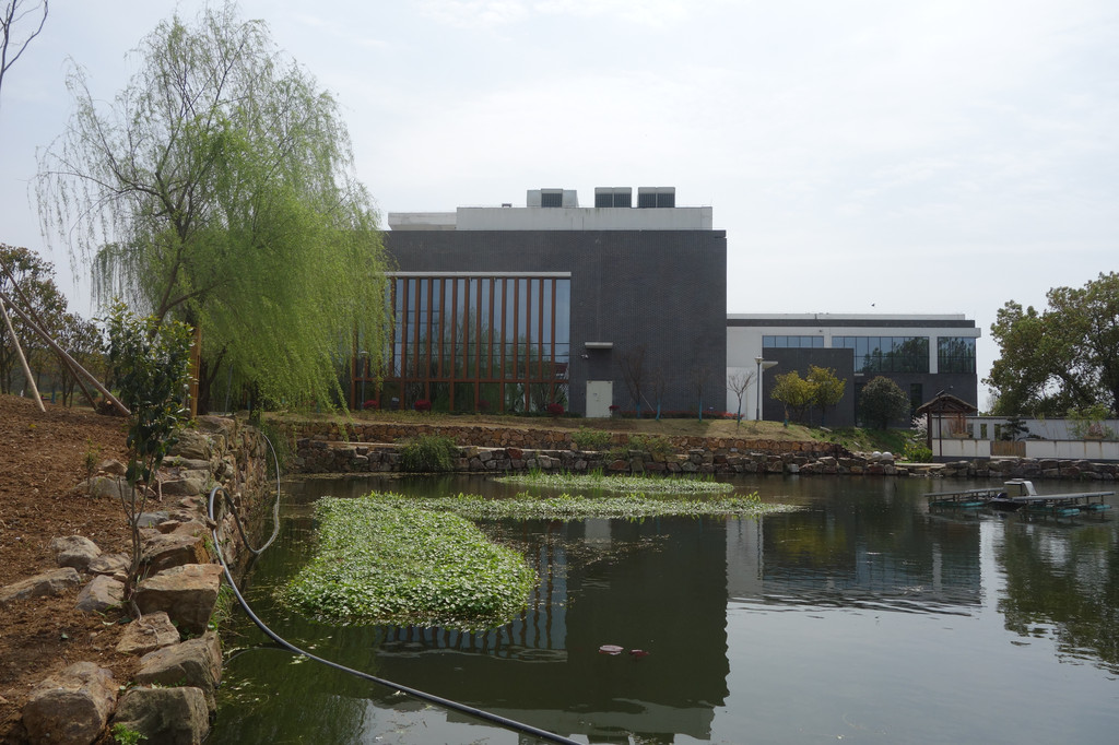 池塘边又一栋体量较大的灰色建筑,与游客中心的建筑风格类似。