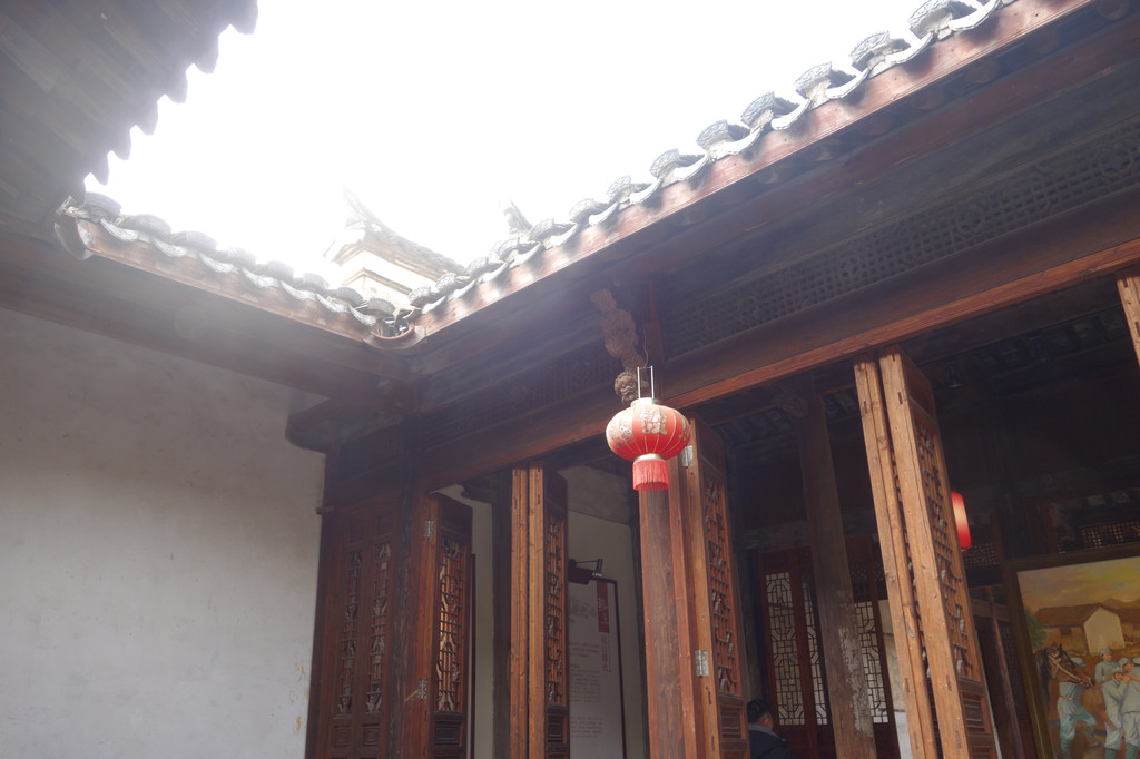 柱子、房梁、石刻都非常精美,屋檐上的红灯笼,给老宅增添了生机。