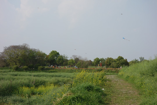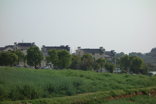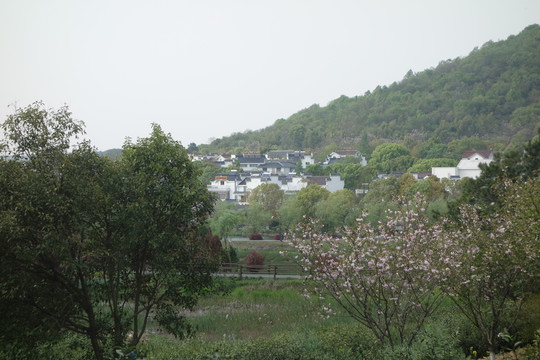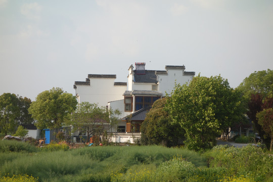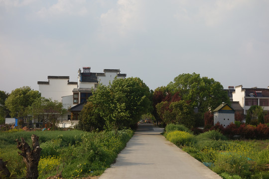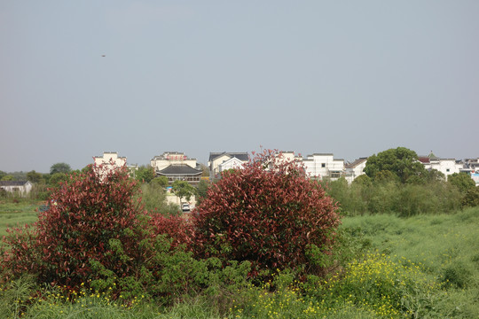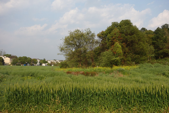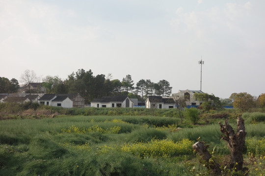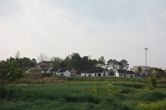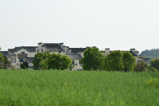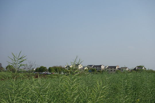 麦田,油菜田的绿意中是粉墙黛瓦的村舍。