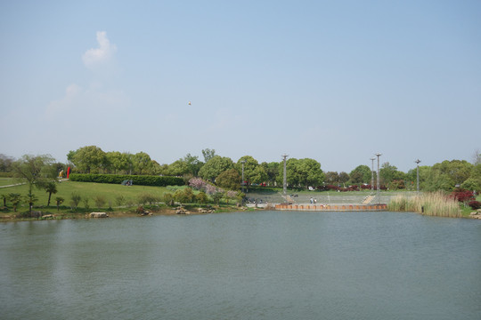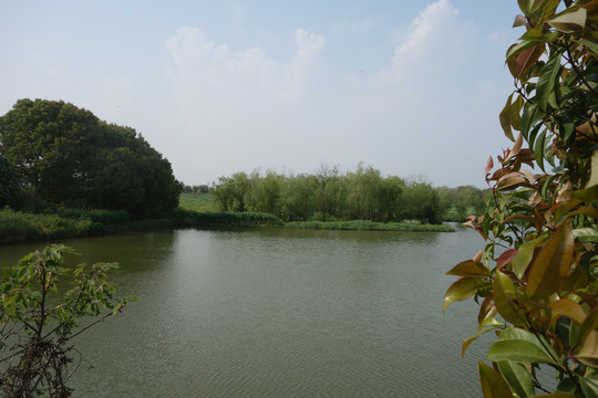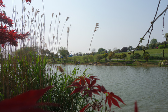 水边芦苇飘荡,小山岗上樟树成行,绿意荡漾中粉色的桃花点缀其间。