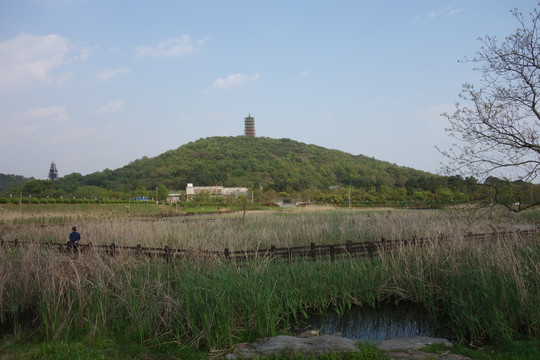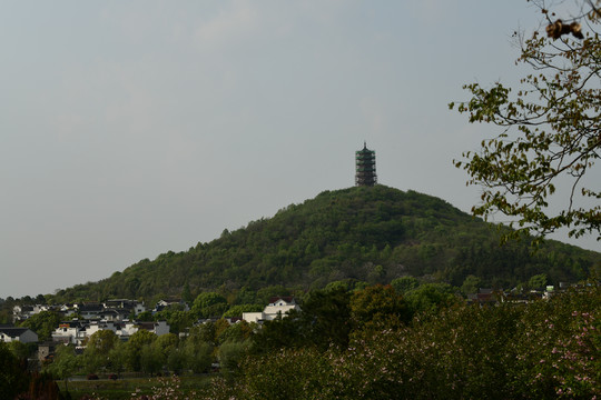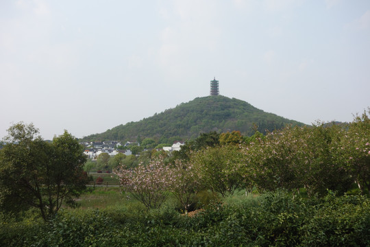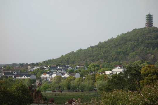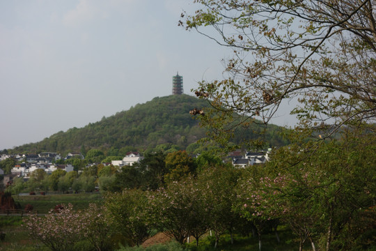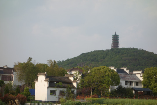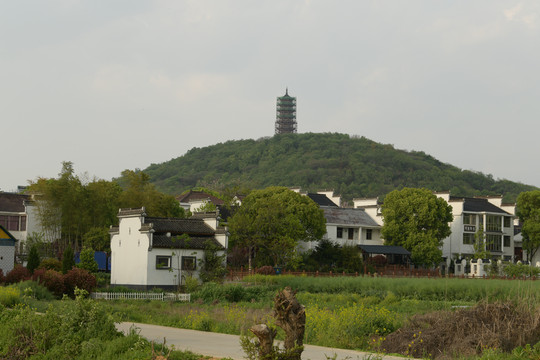 这个角度的景色是丰富的。不远处的小山上一座文峰塔,山脚下村落有致的白墙黑瓦的村舍。
