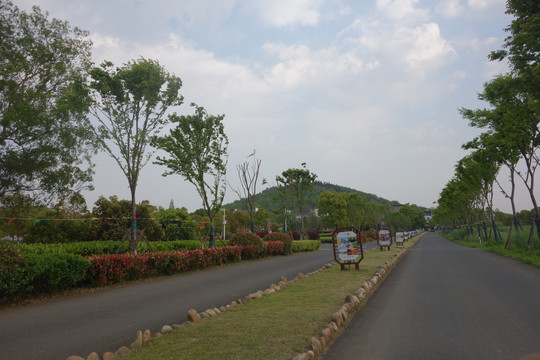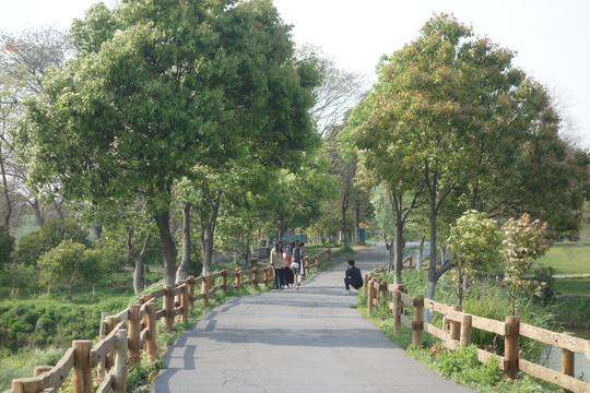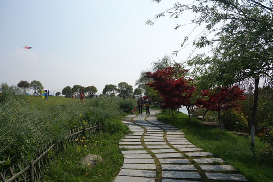 车行道的一侧用红色加以区分了健身步道。这里有步行道、自行车道、电瓶车道、和城市道路,满足不同人群的需要。看你选择哪一条路去感受慢城。