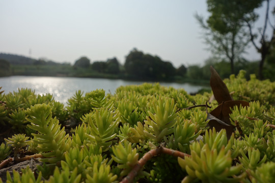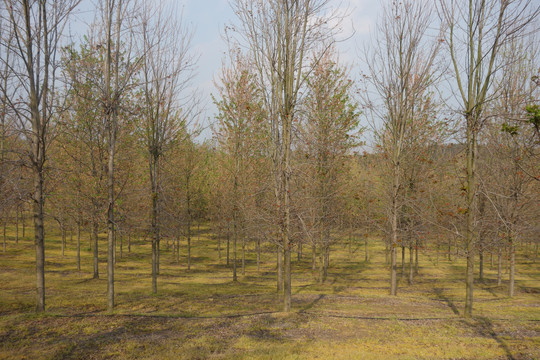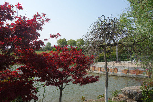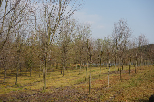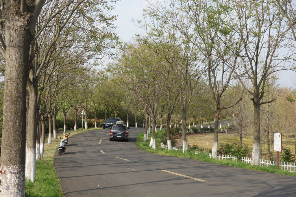 道路的右侧一排排成林的枫树。此时的枫树不是火热的红,才出嫩芽,嫩黄绿色,地上一行行的黄绿就像一块条纹地毯,春季的枫彩园就是这样的清新。