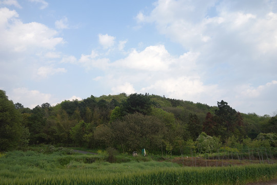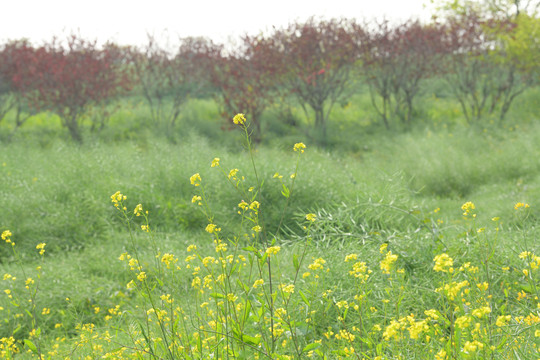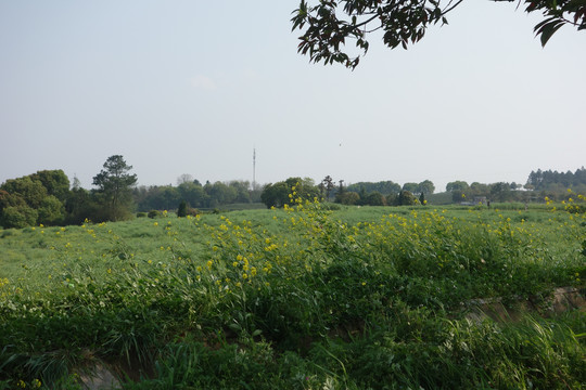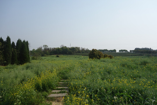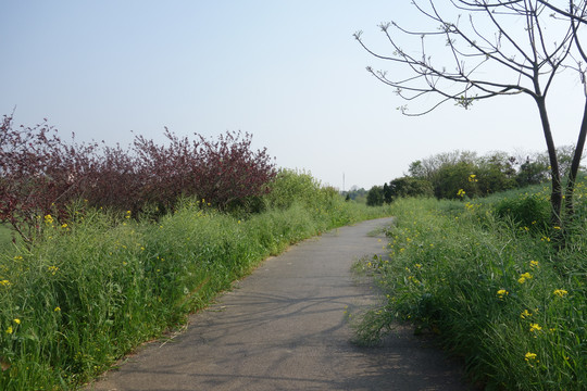春天到处都是绿色的,桃红,黄菜花点缀,如同一幅淡雅的水彩画。