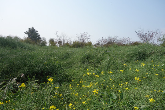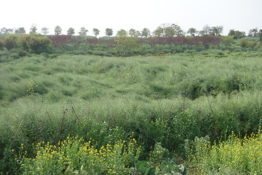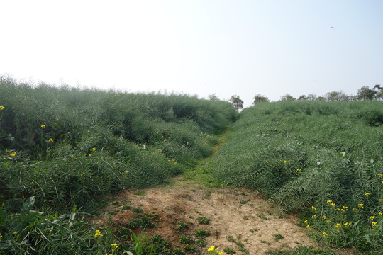 这里的油菜花有一人多高,当我接近它们,我这小身板就被淹没其中。此时花儿褪去菜杆上挂满了菜籽角,绿油油的一个个饱胀丰满的马上要崩裂一般,是风儿将他们吹拂在地,还是重量使他们自然的匍匐在地?