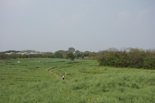 半个月前这里是金花绿叶的田野。想象一下,金黄的油菜花,绿色的行道树,白墙青瓦的农舍,层次分明,色彩丰富,惹人遐思。此时褪去的金黄被绿色的菜籽替代,有了另一种素雅的美丽。