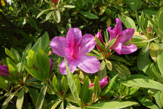 绿色中的粉色映山红。映山红是我童年时的美好记忆。童年时代都是纯天然的东西,花卉也是纯天然的,那会四五月的漫山遍野的映山红是童年的记忆。