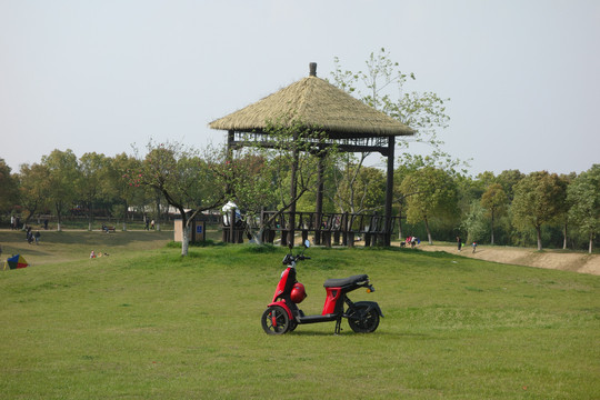 一辆红色的电动车静静的屹立在绿色的草坪上,整幅画面充满温馨感。