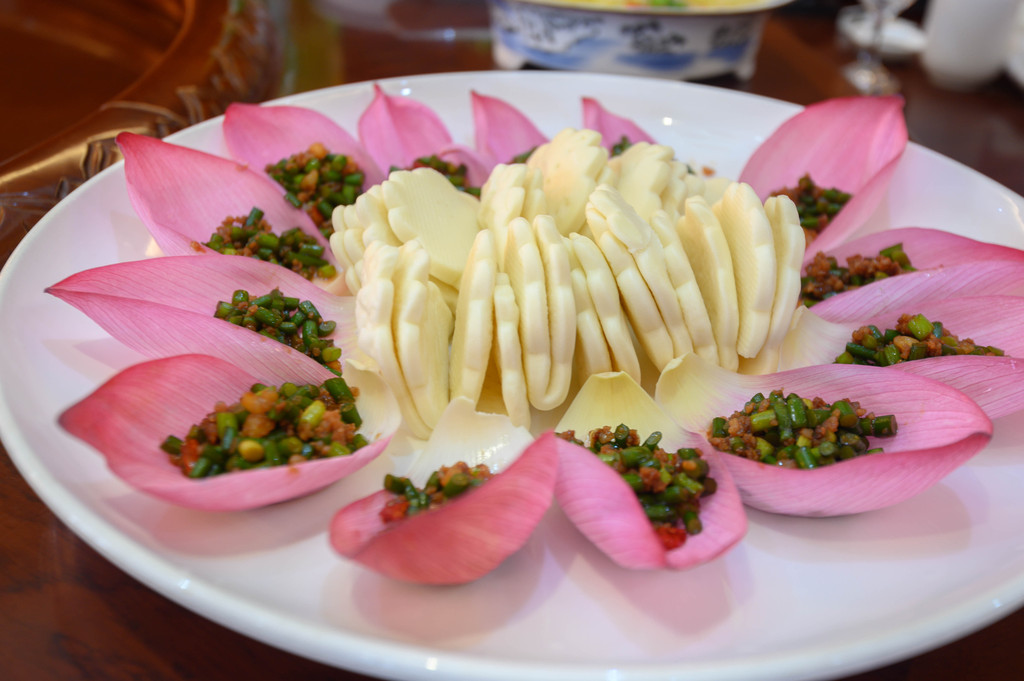 来到高淳,高淳的美食一定要尝尝。固城湖快乐垂钓酒店的虾滑蒸花甲、花开富贵、农家锅巴、糖醋藕尖,好几道都和荷花有关。