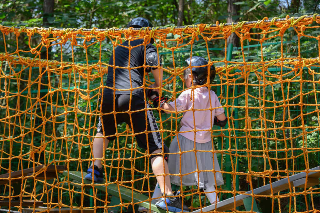 丛林穿越深受孩子们的喜爱,大小孩子们戴好安全头盔结伴穿越,还看到一对很有爱的兄妹,哥哥拉着自己的妹妹努力前行的画面。