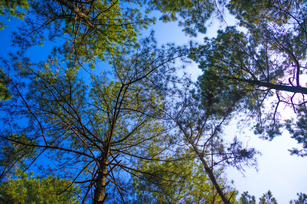 穿梭在树冠之中,满眼的郁郁葱葱,还有那远处的水道。