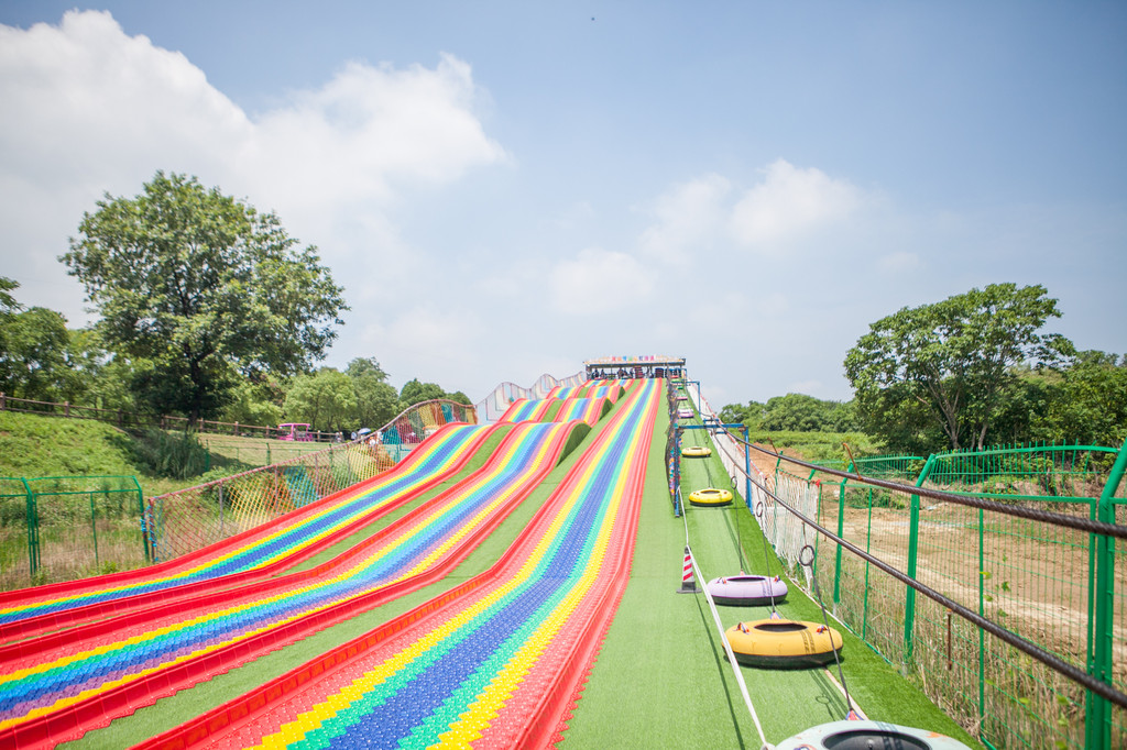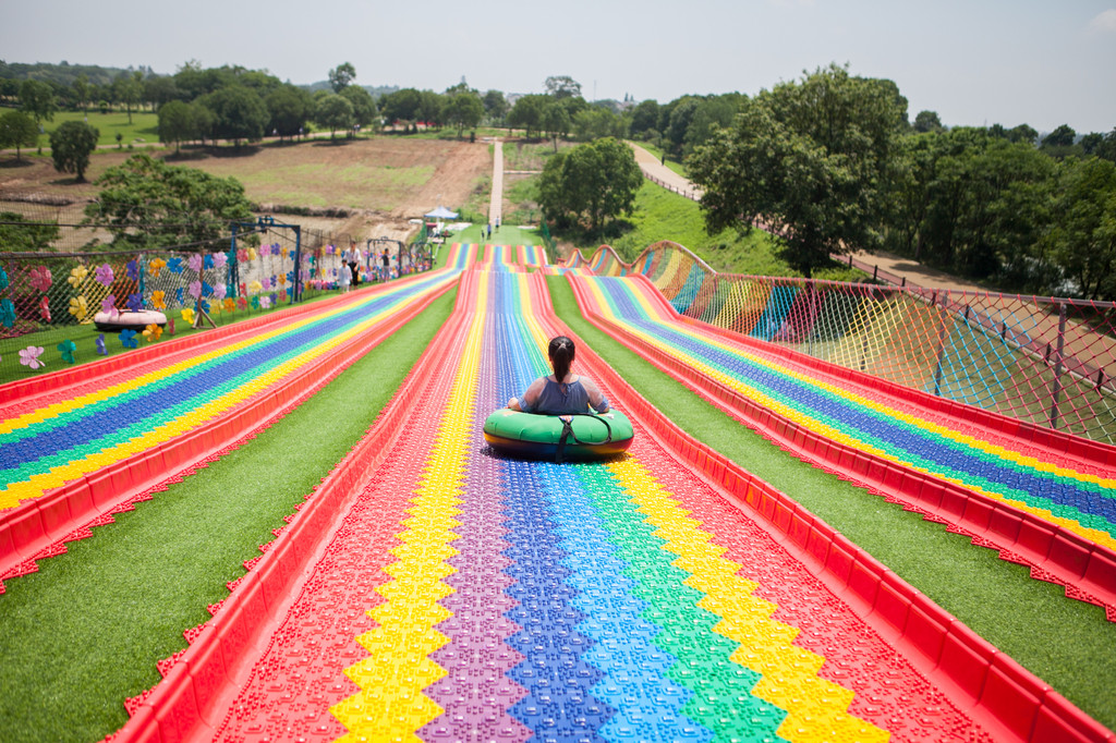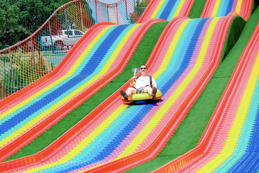 彩虹滑道,在酷炫的七彩色中体验急速滑落的刺激感。最有意思的是,滑道分波浪和直行两种。波浪型的滑道,还能体会到自由落体的刺激感。