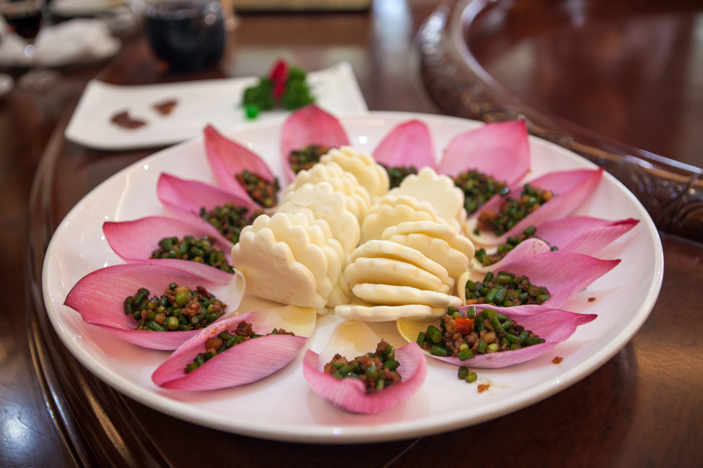高淳美食,就是典型的江南美食。不过,这次有一道菜,让我印象最深刻。固城湖水慢城景区里的快乐垂钓酒店,由于荷花正盛开,酒店做了一道应景的创意菜,叫“花开富贵”。主要食材是荷花、馍、配料。味道真不错,有一股清香。另外,酒店还提供垂钓,非常有趣。