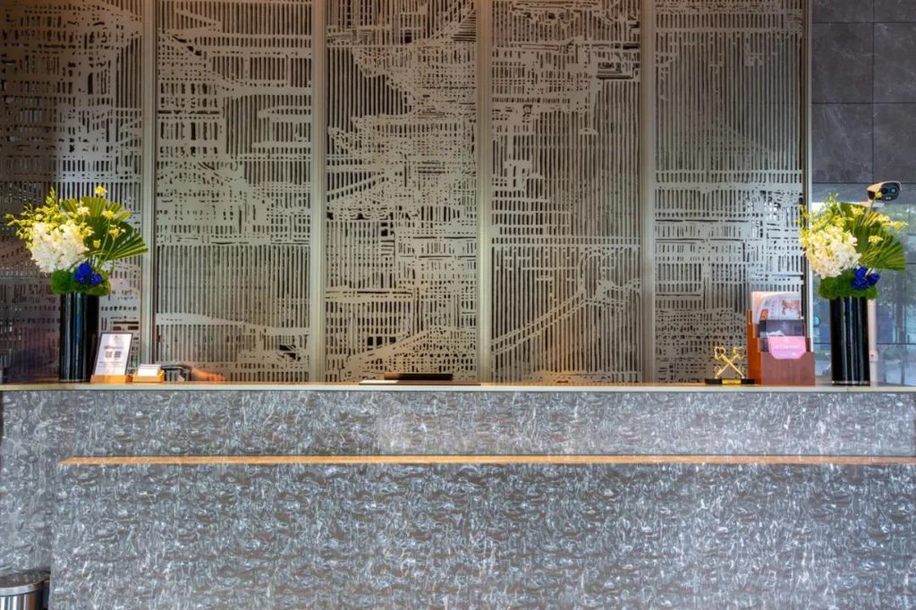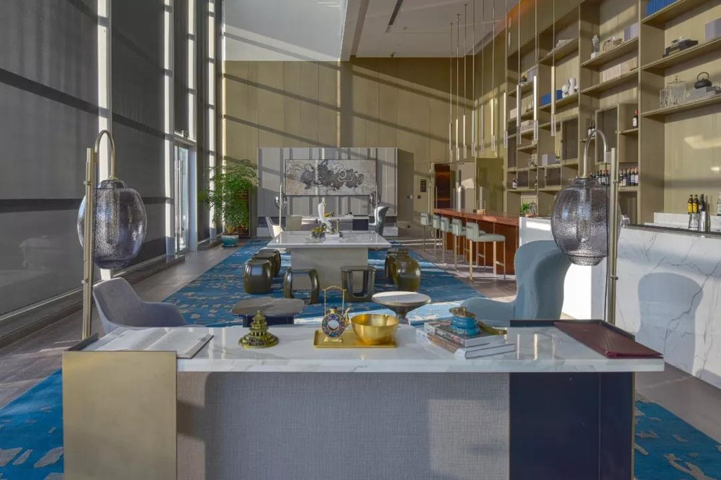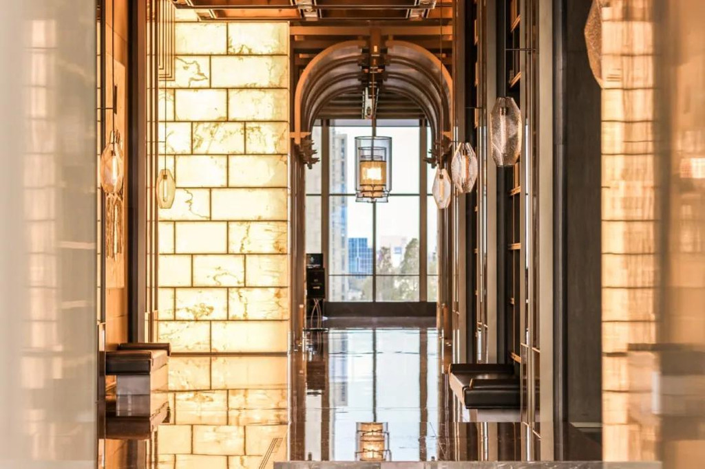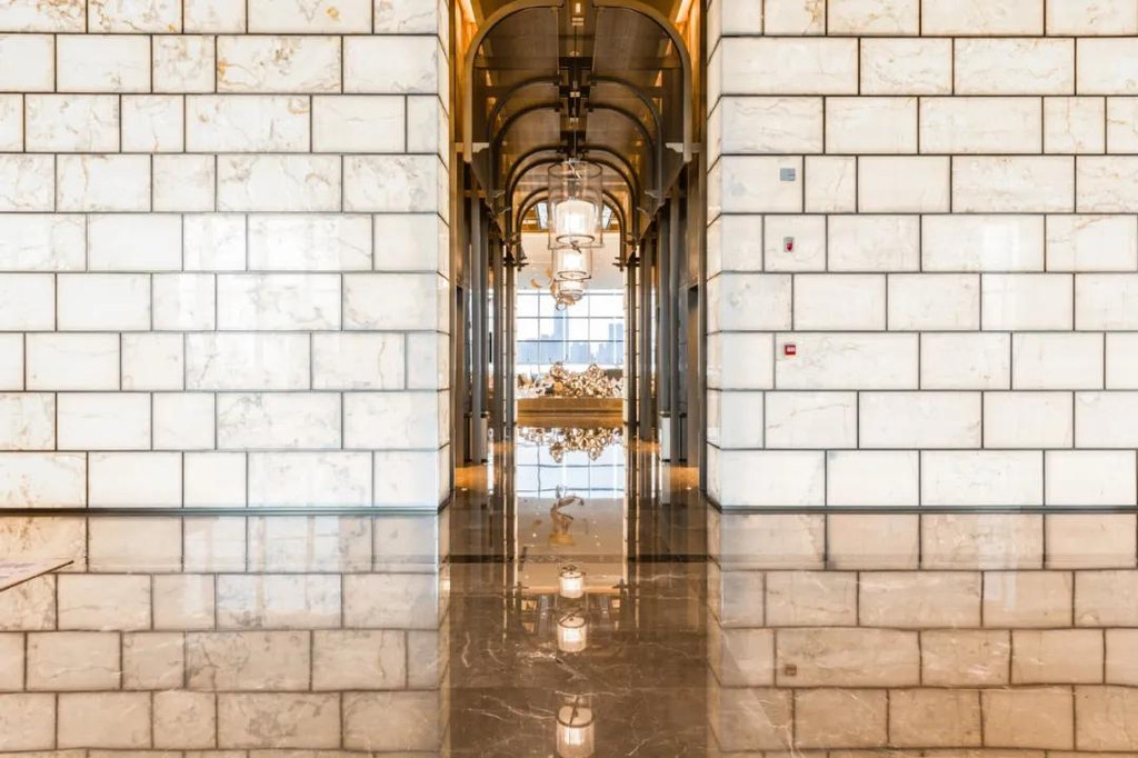 酒店的入口藏在主干道的背后,无意间增加了酒店的私密度。一楼是欢迎大堂,一角设甜品吧。来到这里,已然可以感受到设计师为这间酒店所做的努力。在南京凯宾斯基酒店里,明朝历史不是被简单复制粘贴的,YANG设计团队以现代设计手法重构了古典元素,将宫殿、皇朝文化的繁复化为简约,更为现代人所理解与欣赏。