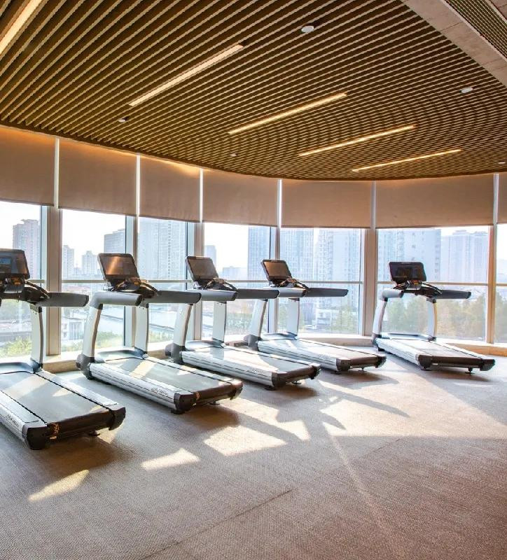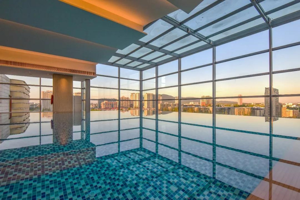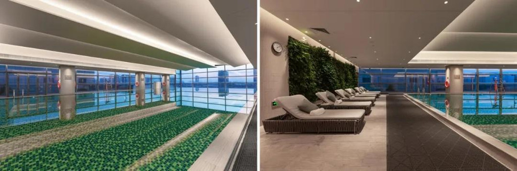 最后不得不提的是,我非常爱它家的健身房和泳池。健身房(设有独立瑜伽室)景观优渥,运动的时候就更容易有饱满的情绪和愉悦的心情。泳池面积大、颜值高。泳池悬于空中,一面由落地窗陪衬出无边际的效果;另一面则用精心打理的花艺,模糊室内外的概念。傍晚的时候,夕阳映衬下南京的天际线,特别美!