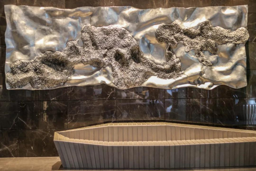 无论是一楼迎宾柜台的镂空背景墙设计,还是一侧装饰雕塑的提炼,都让人看到了不一样的“历史感”。