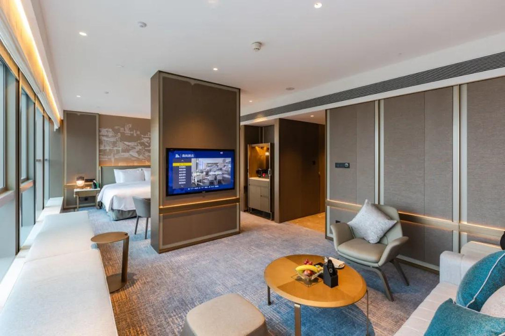 这份不一样,在五楼电梯门打开时更被无限放大,映入眼帘的是大幅面的“明城墙”。这里是大堂,以宫城建筑和皇宫正殿为设计元素,用现代手法塑造堂皇气象,凸显尊贵的迎宾礼节。
