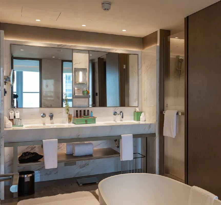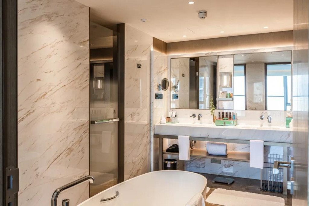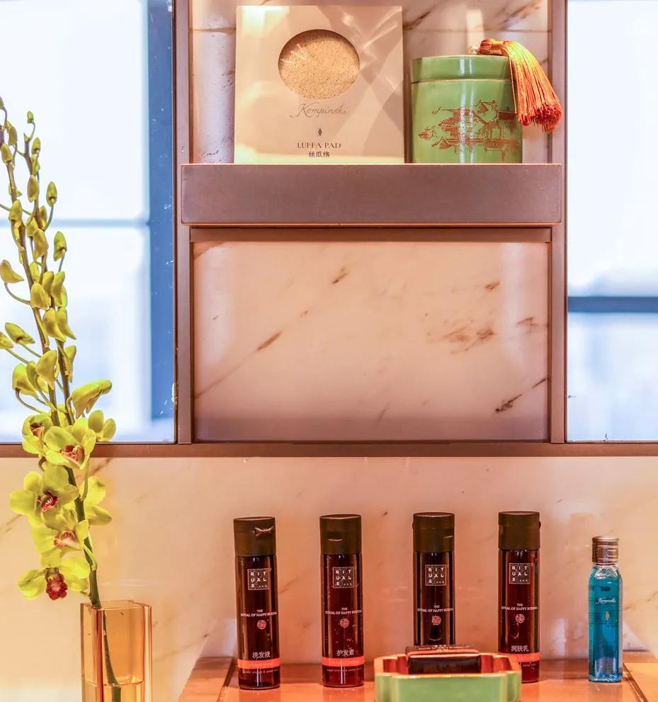 这间套房的卫浴采用贯通式设计,无论是从外面初入房间,还是在夜晚就寝之时都方便使用。充满质感的哑光铜制构架、置中摆放的超大深泡浴缸、独立的步入式更衣柜等都保证了畅快的使用感。而我个人是非常偏好它家选用的洗护备品Rituals的,这个荷兰品牌骨子里却有着强烈的东方味道,大量运用亚洲植物作为基底,满满的度假感。