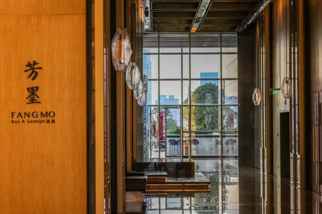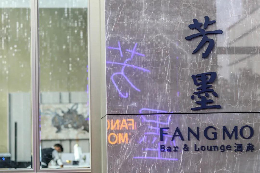 芳墨,“千载垂芳在诗墨”。我毫不掩饰地说,我是被这个文艺范儿的名字给吸引过去的,这也是南京悠远文化史的一个写照吧。穿过酒店大堂的电梯厅,“芳墨”的指引让我来到了这间酒廊门口。霓虹灯管的logo映照在主logo的墙面上,仿佛是现代与传统的碰撞交织,也暗暗隐喻这里的白天黑夜是两种截然不同的风情。