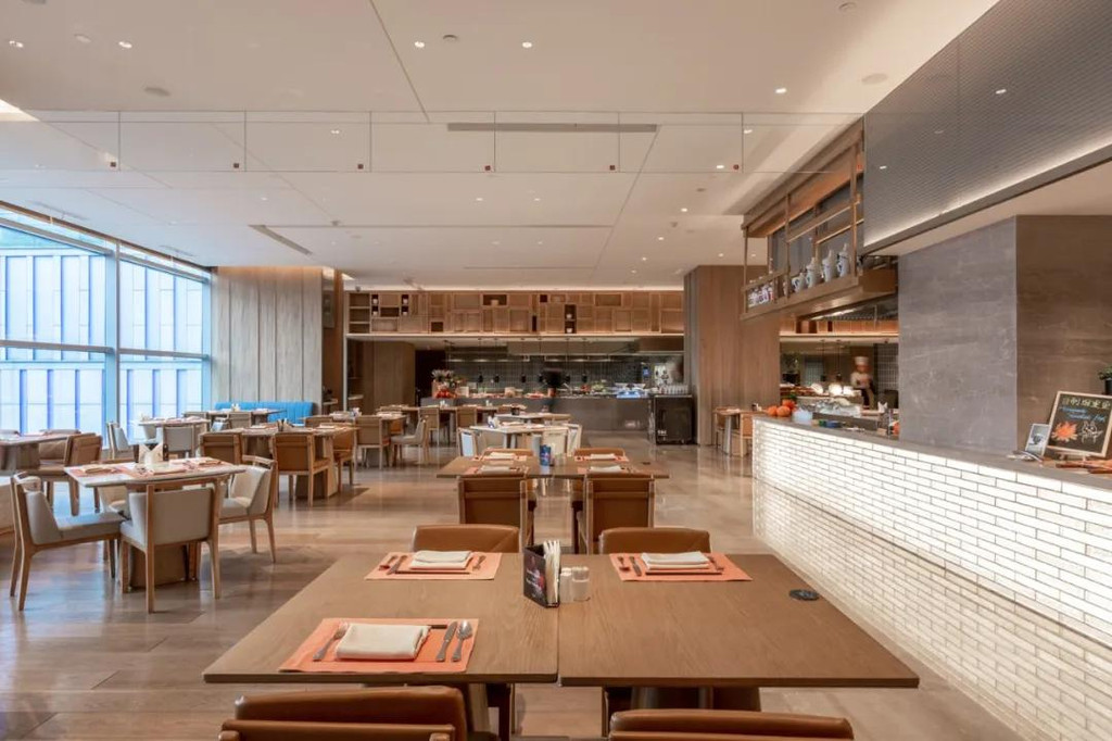 本味餐厅融入“金陵酒肆”元素,取餐台与吊柜上的窗格意象构造街肆档口之景,让就餐变得更有趣味。