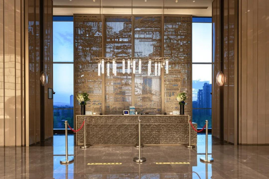 前台的设计同样气度非凡。两幅巨大的金属镂空艺术屏风,以双层金属重叠方式勾勒出宫殿的层楼叠榭,既将人瞬间引入历史幻境,又解决了“大堂东西朝向导致日间光照强烈直射空间”的问题。而这组屏风又与大堂尽头的画作相呼应,不停地向人们重复着明故宫的辉煌。