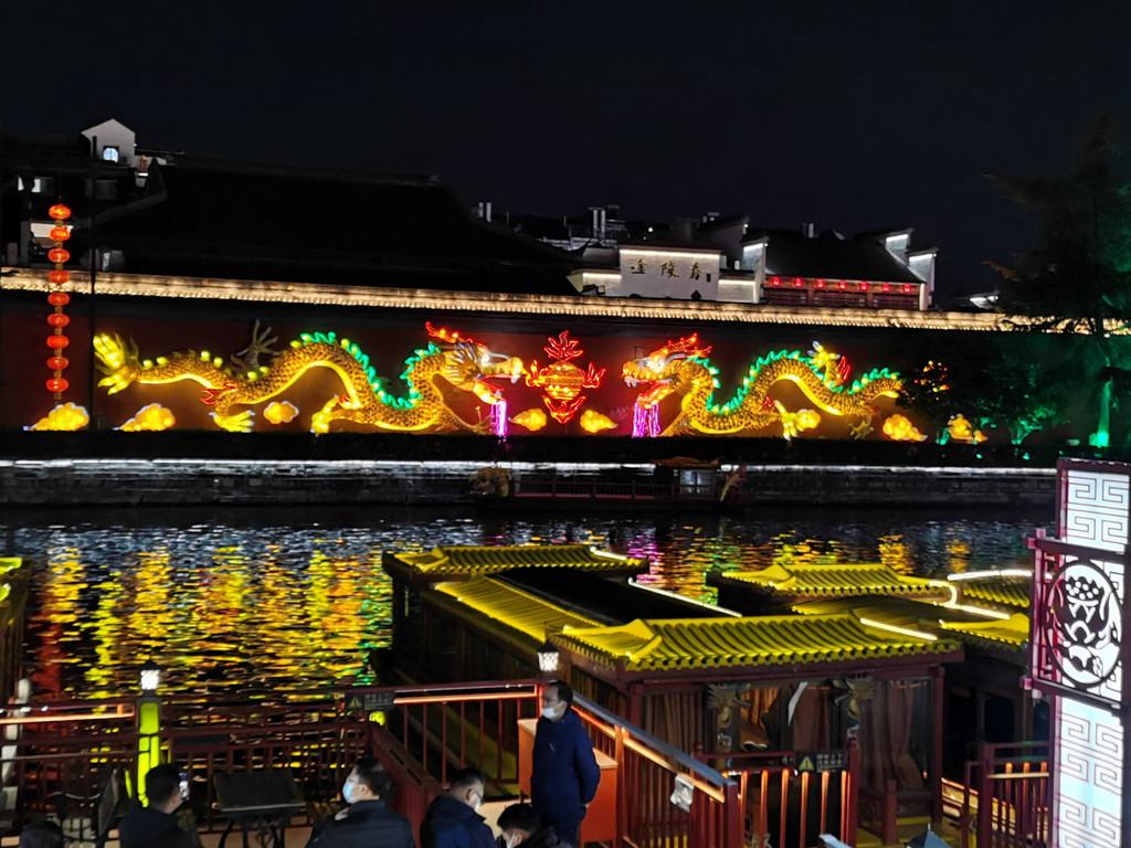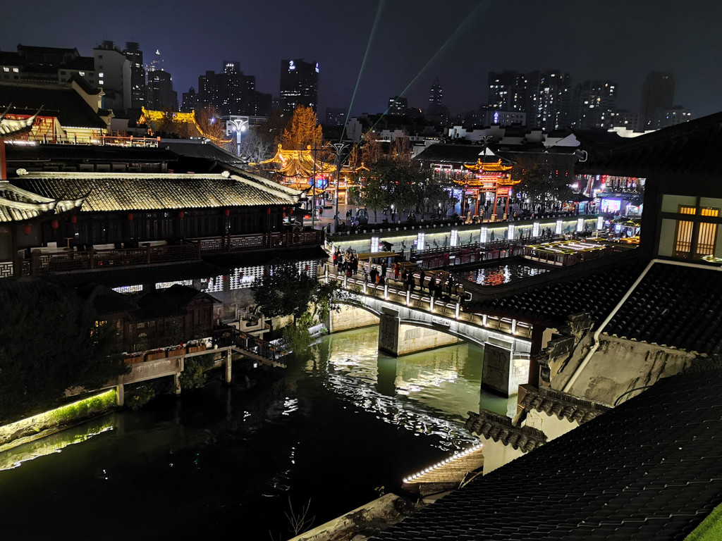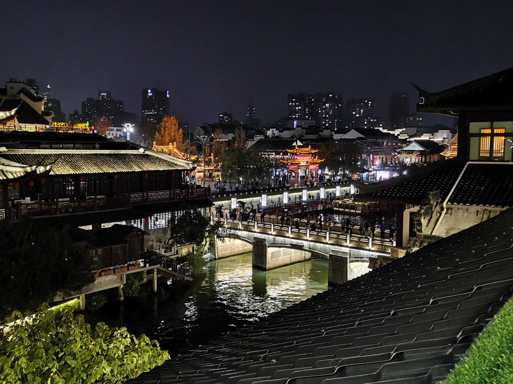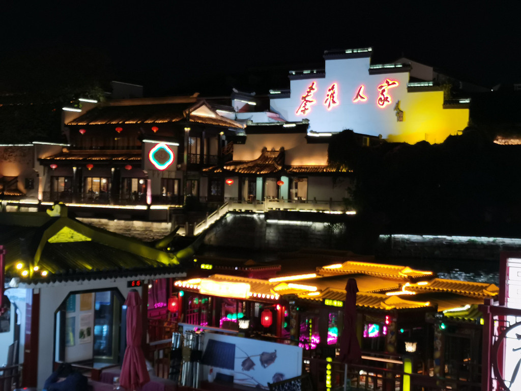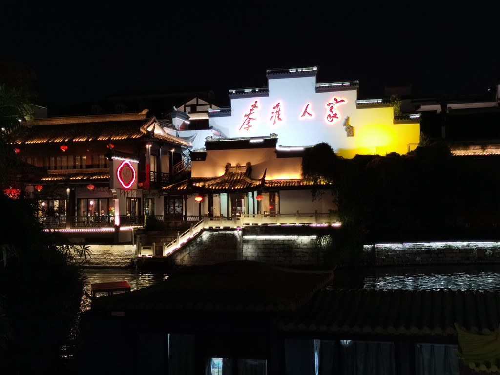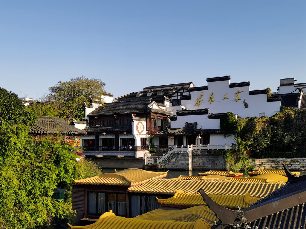 秦淮河在夫子庙这一段,可是最引人注目,也最是显尽风光。这一侧广场,古街、牌坊。在另一侧是巨大九龙照壁,还有那醒目的秦淮人家。都是满满的古风会把人带入曾经的古韵之中。秦淮河不是很宽,缓缓流动。在独特的拱桥之上,是最佳的视角,人们总是在此地留影观赏。在霞光中看斗角飞檐;赏画船慢度。在夜色中观红灯亮起;流光溢彩。水光波动、舟船穿梭。如乐声扬起、商女送歌,那意境会醉死人。我终于找到了一家临河的客栈。可以凭栏看灯枕河入梦,还可以对河弄箫故作风雅。沐朝晖夕阴;伴夜色灯火。在夫子庙不仅尝遍了金陵的风味小吃,也是过了一把风雅之赢。虽然在寒冬之际游玩,但是仍然如沐春风。真的很爽!