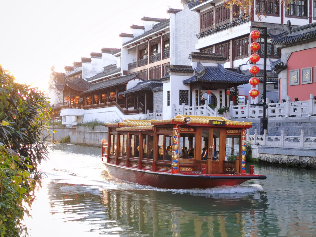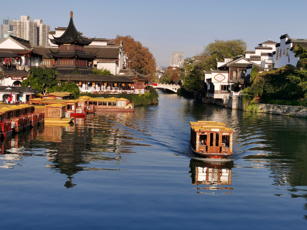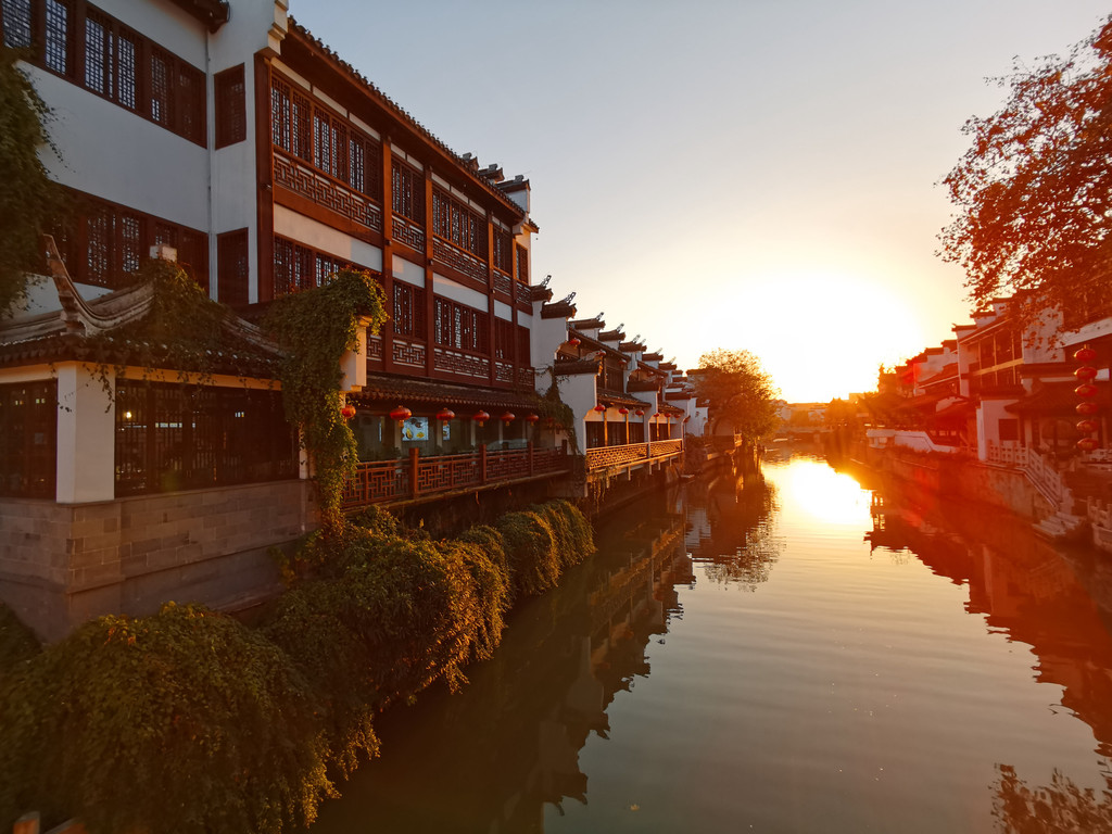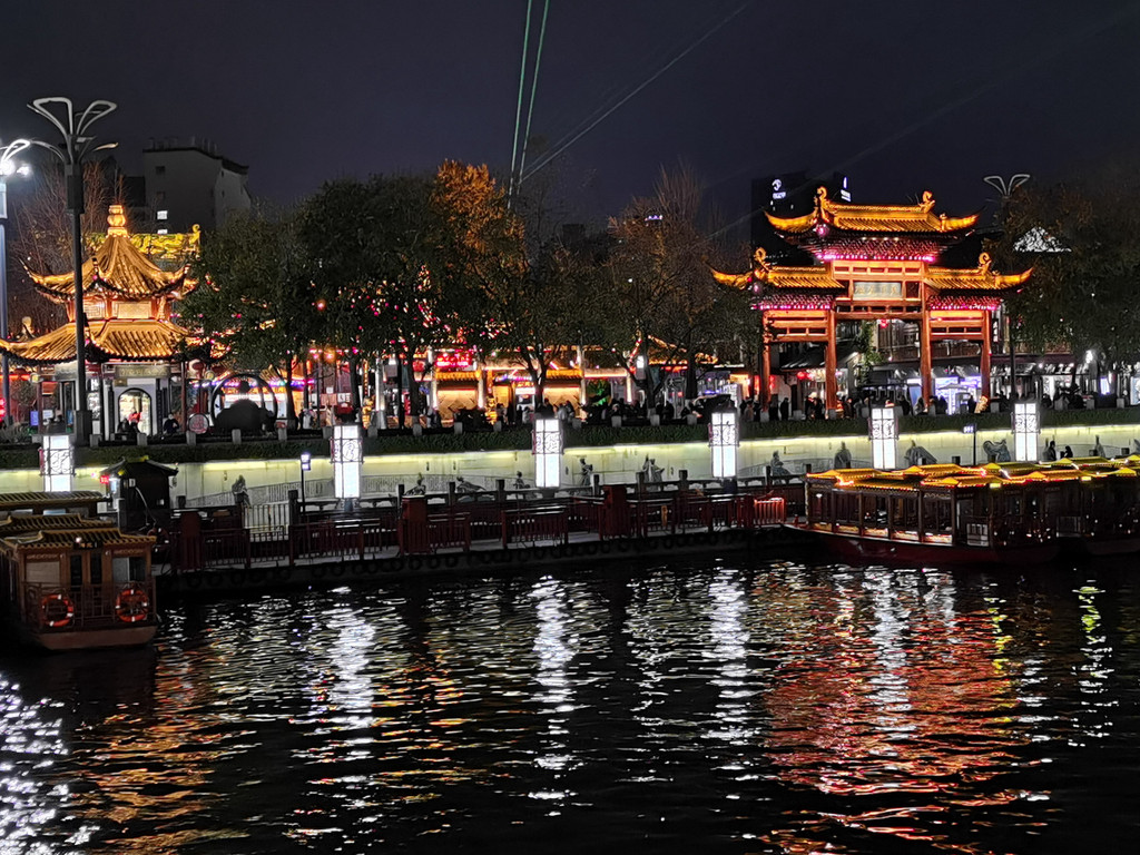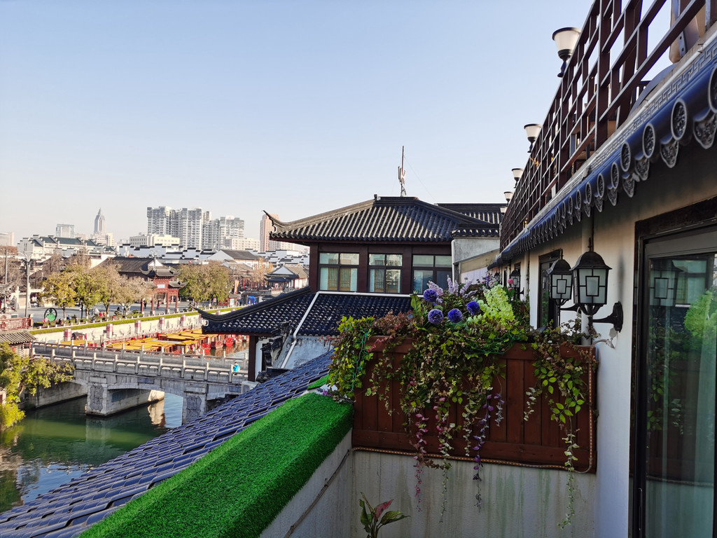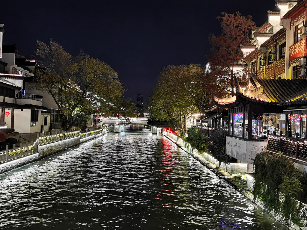 秦淮河在夫子庙这一段,可是最引人注目,也最是显尽风光。这一侧广场,古街、牌坊。在另一侧是巨大九龙照壁,还有那醒目的秦淮人家。都是满满的古风会把人带入曾经的古韵之中。秦淮河不是很宽,缓缓流动。在独特的拱桥之上,是最佳的视角,人们总是在此地留影观赏。在霞光中看斗角飞檐;赏画船慢度。在夜色中观红灯亮起;流光溢彩。水光波动、舟船穿梭。如乐声扬起、商女送歌,那意境会醉死人。我终于找到了一家临河的客栈。可以凭栏看灯枕河入梦,还可以对河弄箫故作风雅。沐朝晖夕阴;伴夜色灯火。在夫子庙不仅尝遍了金陵的风味小吃,也是过了一把风雅之赢。虽然在寒冬之际游玩,但是仍然如沐春风。真的很爽!