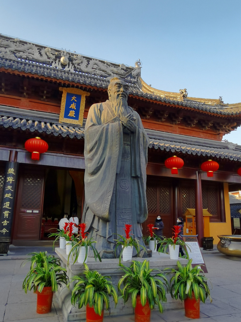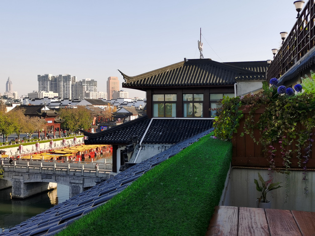 对我而言游南京的最大兴趣是去感受秦淮河的风情。游金陵就是要感受六朝的风韵,唐代的繁华。于是就把宾馆订在秦淮河边,夜枕秦淮河水。秦淮河穿越南京城区而过,但是他的风光带是在夫子庙这一段。夫子庙前立着孔子的雕像。庄严风雅的孔庙、学堂、还有应试考场的贡院。这可是第一所国家最高学府。教化了许多学子,也出了许多的栋梁之才。这里是古代最重要的文化中心,科举重地。古建筑满目皆是。有庙宇、学堂、贡院。也有街道里巷,市井纵横相结。许多各式店铺、餐饮、小吃,显尽了热闹和繁华。还有对面的乌衣巷以及朱雀街。都是南朝遗风著名的地方。来此不为采风,就为领略这些诗篇的意境。