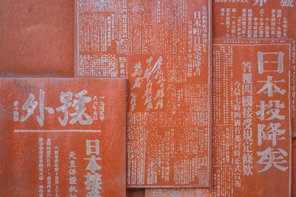 在室外部分,从甬道入口到出口总共设计了14个雕塑单元,有“九·一八”事变、卢沟桥事变、南京大屠杀等墙体浮雕,象征中国人民从“九·一八”事变到抗战胜利14年艰苦卓绝的斗争,胜利广场主雕“胜利时刻”便会映入眼帘。