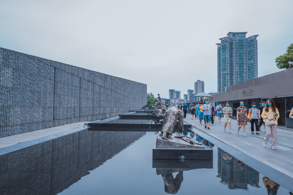 (二)遗址悼念区:该区包括“古城的灾难”大型组合雕塑、“历史证人的脚印”铜版路、《狂雪》诗碑墙、石壁墙与邓小平手写馆名、墓地广场、浮雕《劫难》《屠杀》《祭奠》、“母亲的呼唤”立雕、“万人坑”遗址陈列和悼念广场祭场、冥思厅等。
