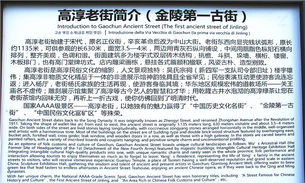高淳老街以古老和奇特而闻名,为国家AAA级旅游景区,省级文物保护单位。