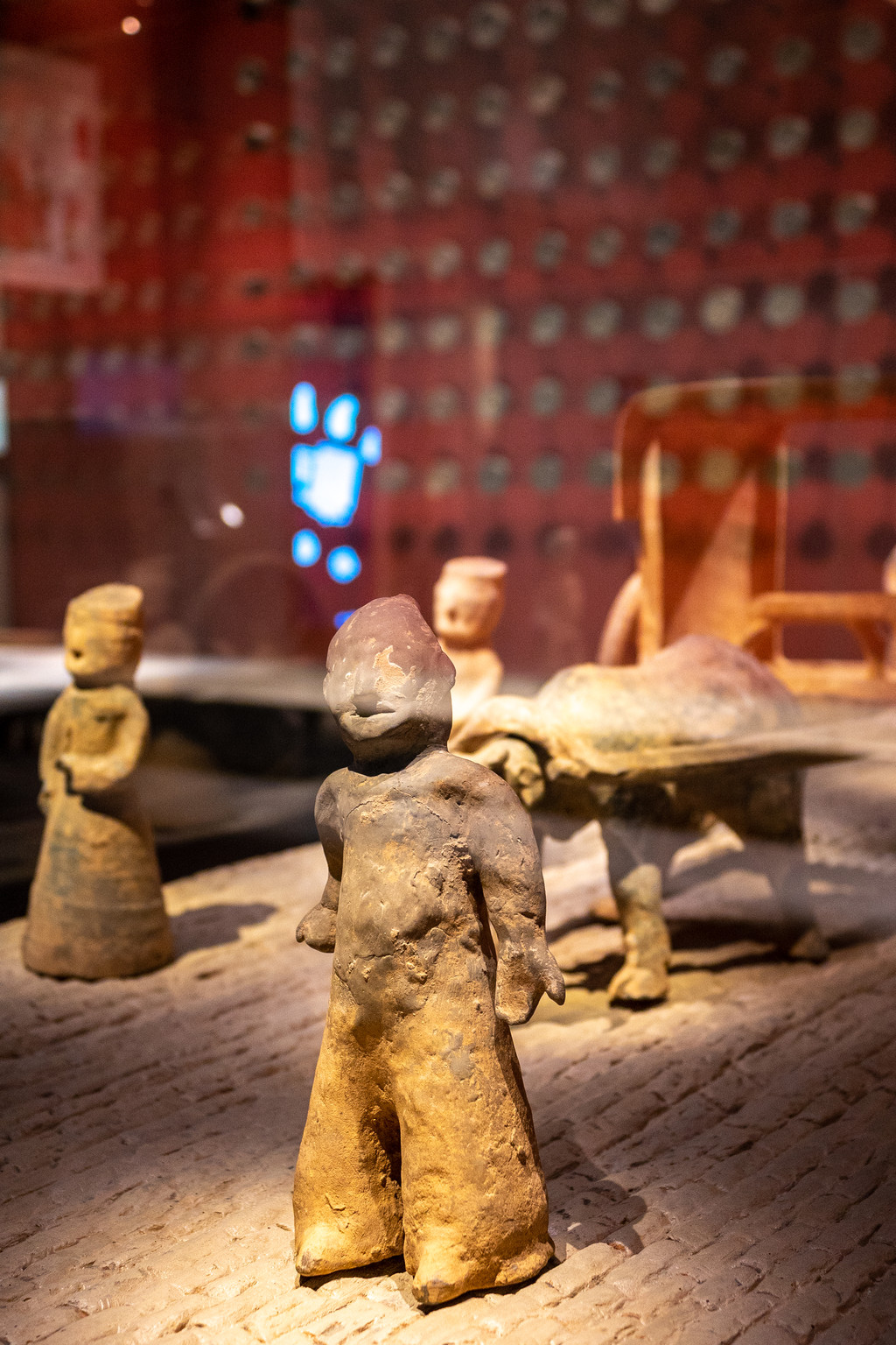 走进博物馆,最先参观的是地下一层,这里主要展现了当时建康城的宫殿、建筑、道路、排水系统等,除此外还展示有大量文物,六朝食谱、牛车、陶榻、瓦当等,再现了六朝时期人们的衣食住行。