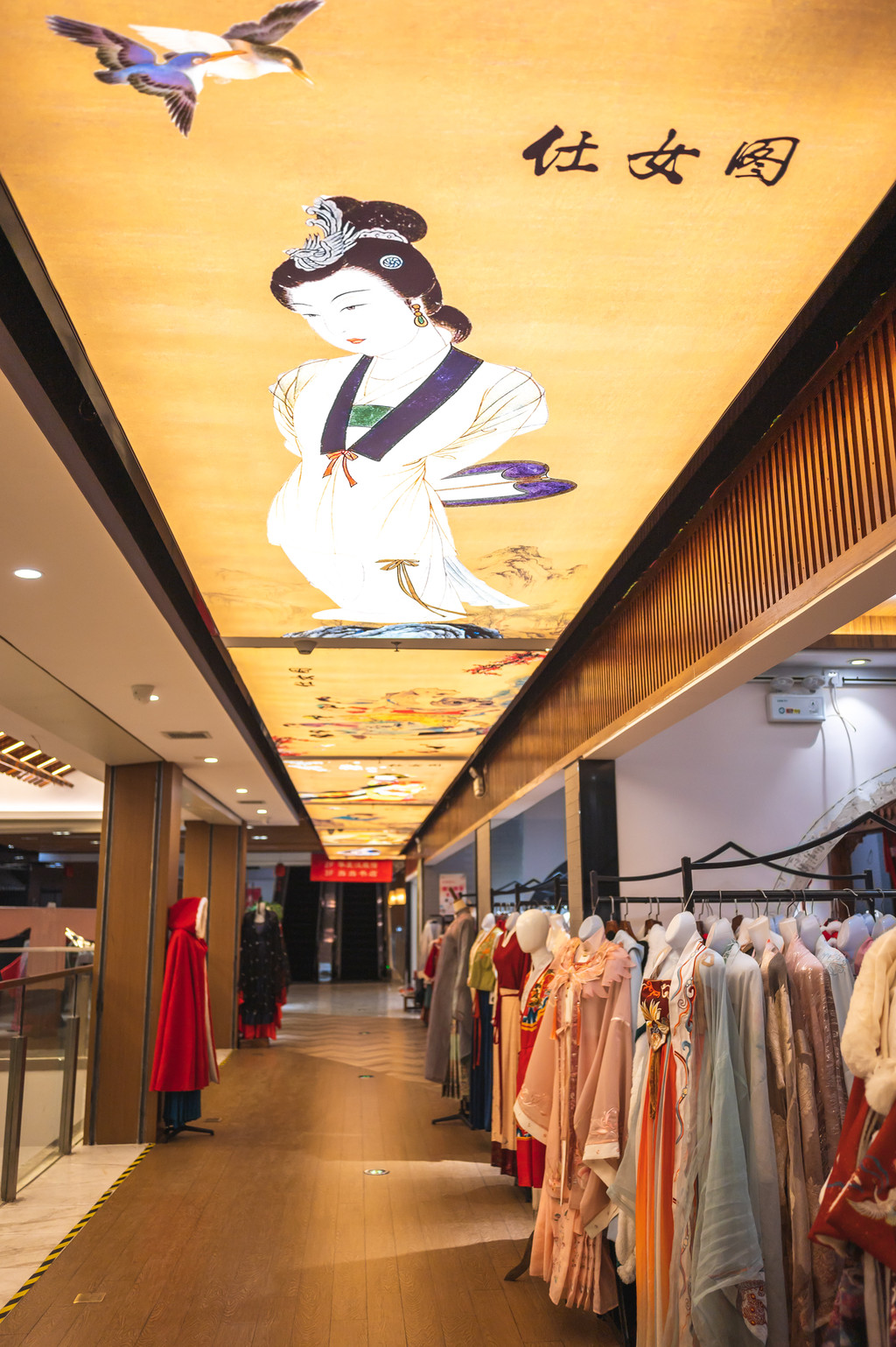秦淮礼物二楼为华裳汉服馆,满满一层的汉服,填补了夫子庙没有大型汉服馆的空白,对于喜欢汉服的人来说这里是必去的地方,租上一身汉服,漫步夫子庙,恍若穿越到了六朝时期的南京。