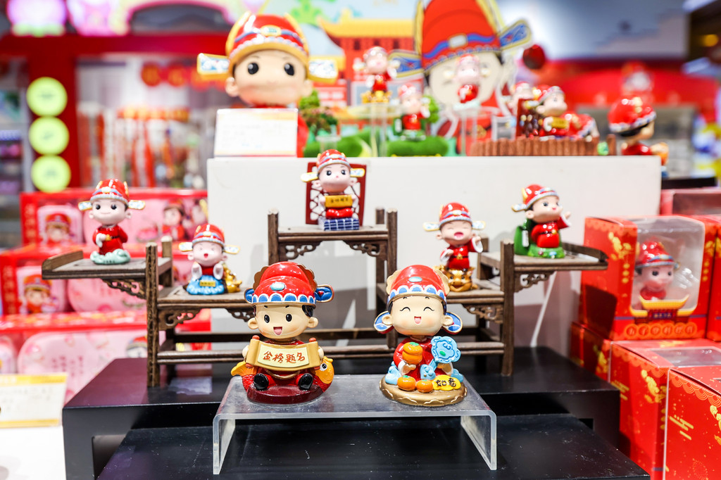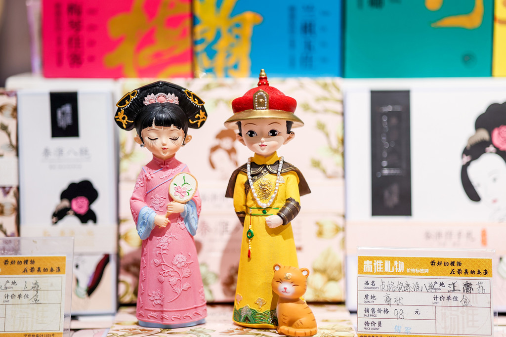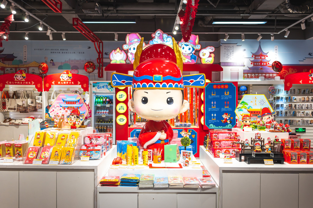 走进一楼,迎面而来的“状元郎”,状元郎系列产品以科举文化为主题打造而来,如今也是“秦淮礼物”的金字招牌,其产品多达600多个种类,其中的“平步青云”、“金榜题名”、“指日高升”、“鱼跃龙门”、“独占鳌头”等产品最受欢迎,就在我们身边的文化,如今也成了可以摸得着的东西。