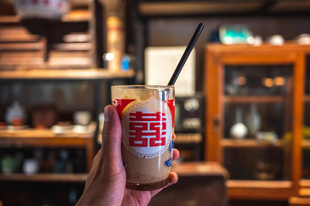 酒酿咖啡的杯子也格外引人注目,小时候用的玻璃杯,大红色的囍字,握在手里是那般亲切,仿佛小时候妈妈给我倒的一杯水。