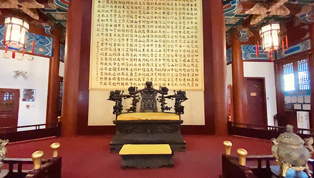 眼前的座椅就是“朱元璋龙椅”,龙椅虽然是仿制品,却是用上等的红木所制,其重量重达千斤,且在龙椅靠背上还雕刻着九条龙,雕刻格外精细,栩栩如生。龙椅背后是镂刻的《阅江楼记》,为朱元璋所写。