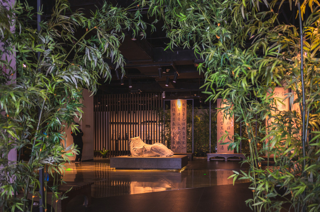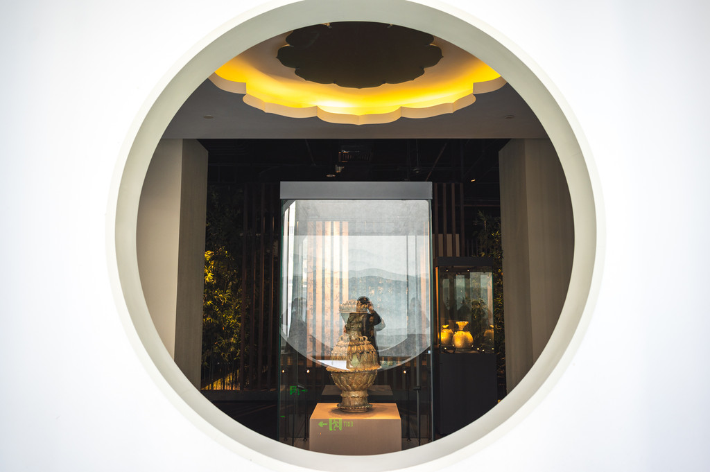 从刚进入博物馆看到的镶嵌于米黄石灰石板之间的78个玻璃窗,被称之为“满天星”,到贝氏“月亮门”、竹子荷叶等置景,营造了一种古色古香的中国古典园林风。