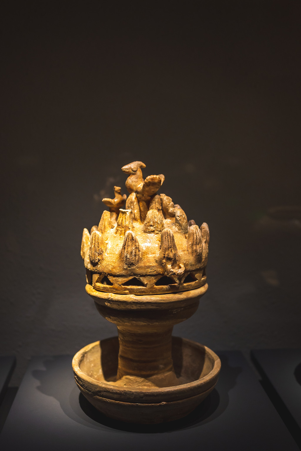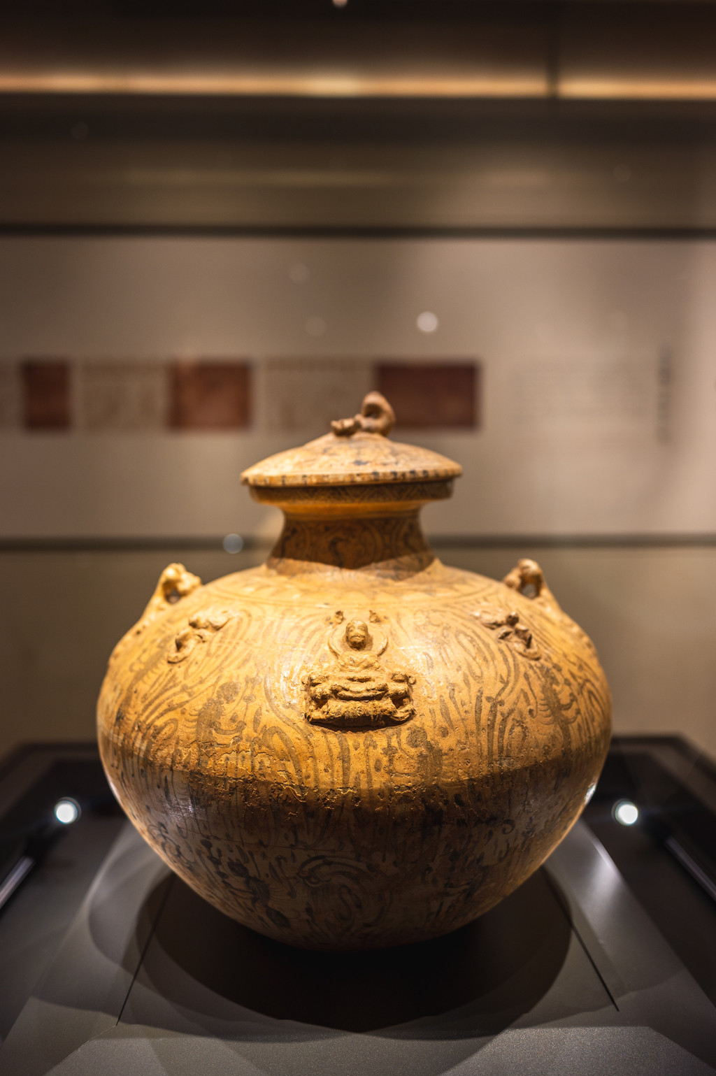 在灯光的照射下,六朝时期的文物散发着迷人的气息,这里展示的文物数量非常多,足足有1200多件,其中镇馆之宝是青瓷釉下彩羽人纹盘口壶和青瓷莲花尊,另外还有蝉纹金珰、玻璃杯、青瓷鸡首壶、铜造佛像等相当珍贵的文物遗存,那精美及栩栩如生的造型让人大开眼界。
