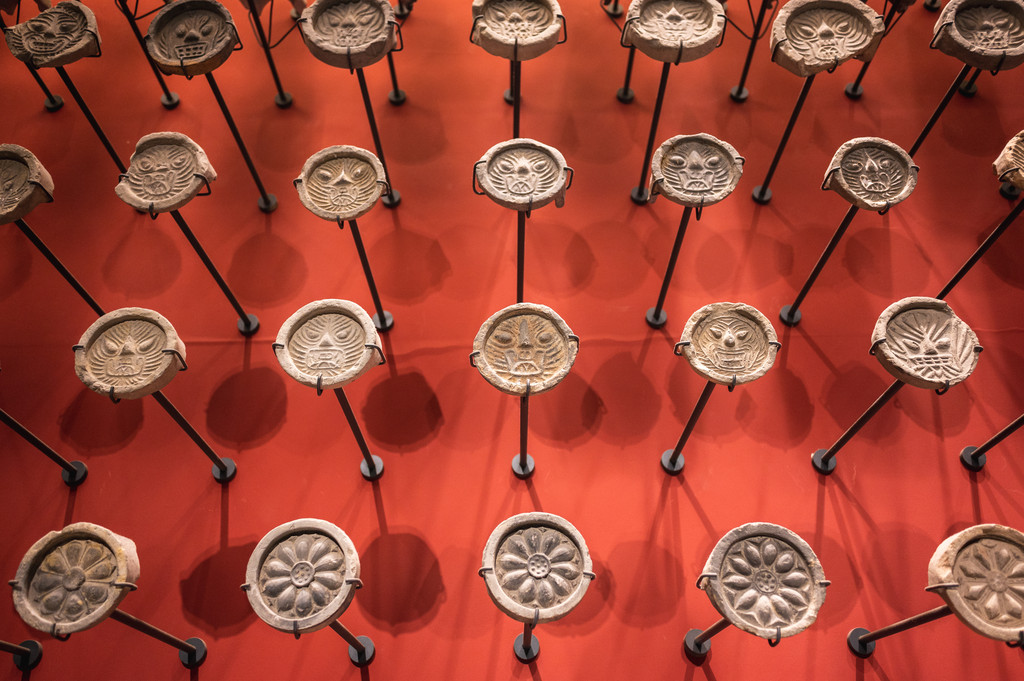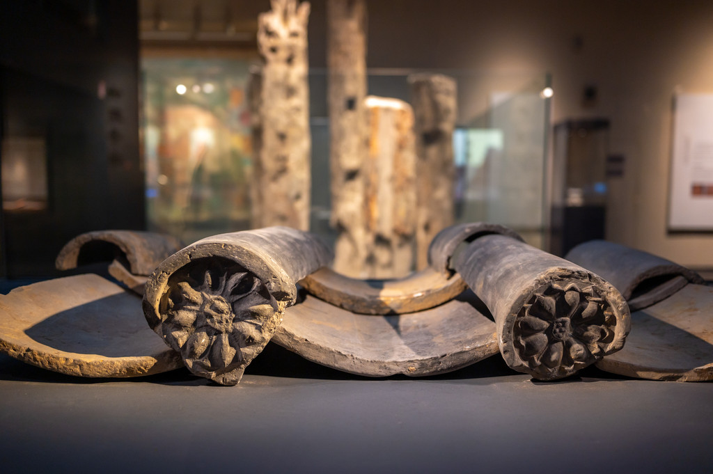 眼前所见的瓦片叫“六朝瓦当”,是古建筑中覆盖建筑檐头筒瓦前端的遮挡,以此起到装饰美化和蔽护建筑的效果,瓦当上有青龙、朱雀、玄武、白虎等做图案,造型格外经精致精美,为我国特有的文化艺术遗产,在博物馆有一面墙展示着六朝瓦当,相当壮观。