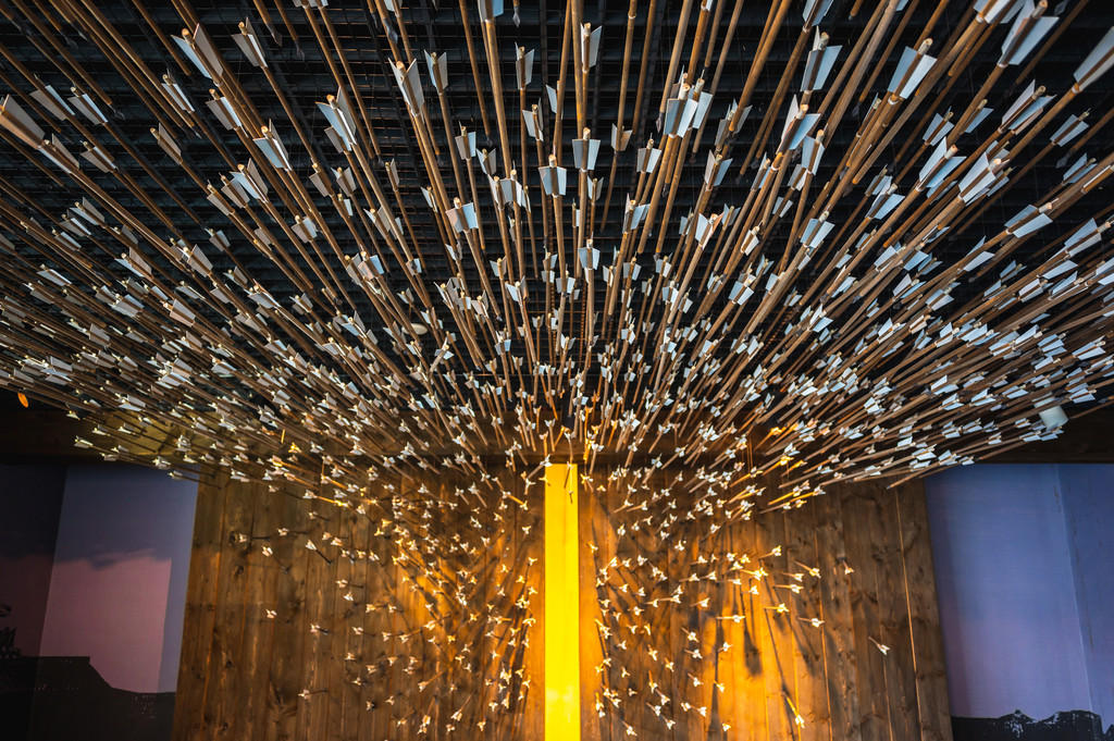 博物馆三层主要介绍的六朝人杰,入口处最引人注目的就是那漫天的箭簇,其灵感来源于“草船借箭”,画面冲击力十足。