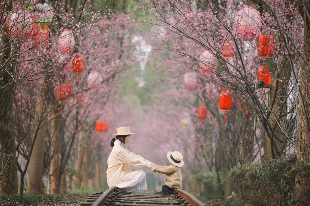 这里的“梅好情人隧道”,有一条逼真的铁轨,两旁的梅花形成一个拱形隧道,好想坐着列车穿越这片梅花的海洋。