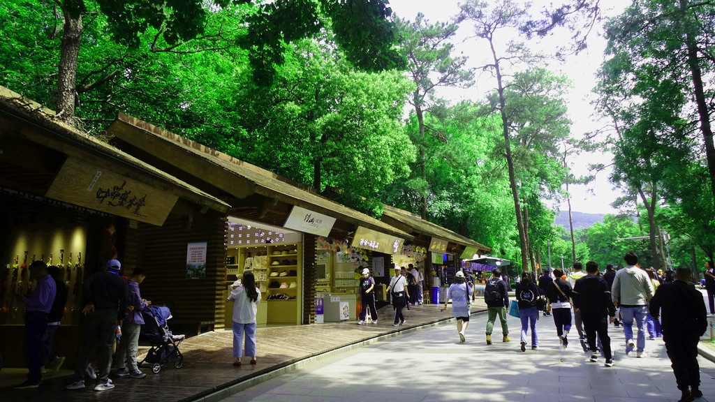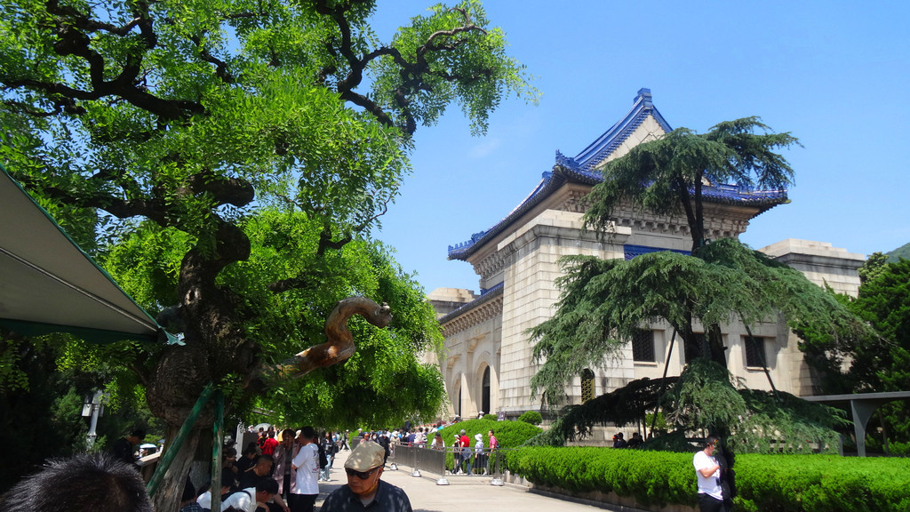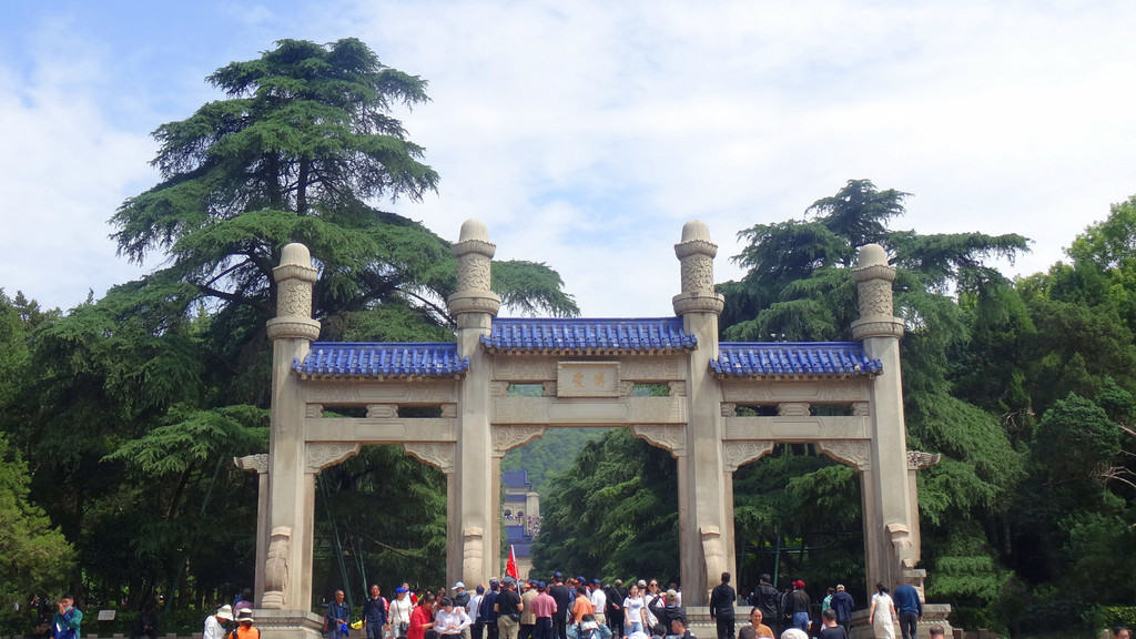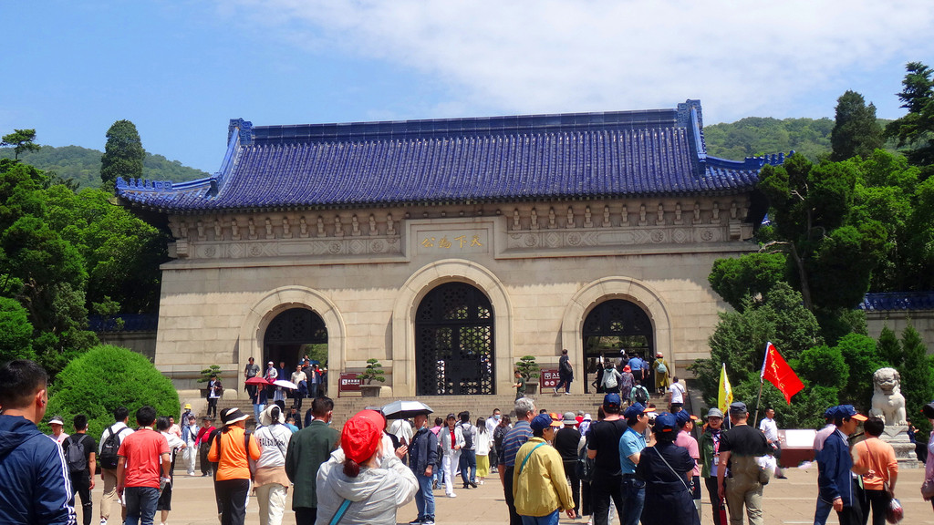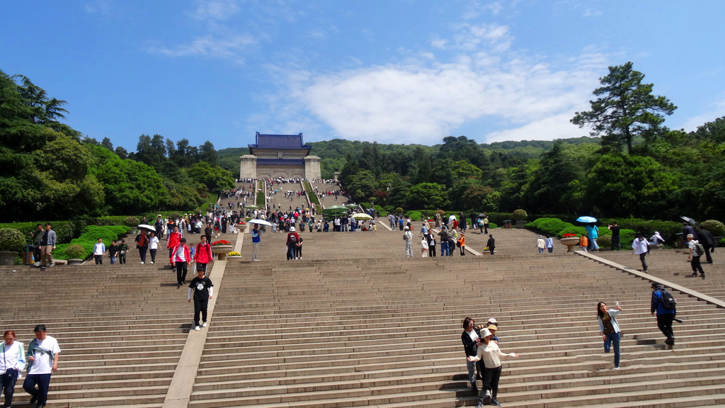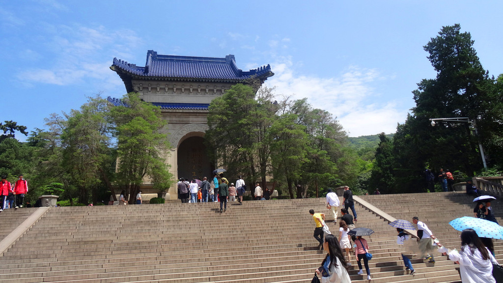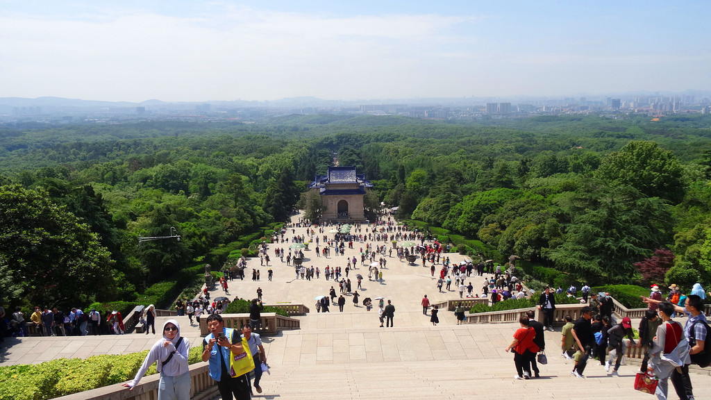 远远的看到了钟山。据说中山陵的设计灵感就是来在钟山的钟,主要建筑有博爱坊、墓道、陵门、石阶、碑亭、祭堂和墓室等,排列在一条中轴线上,体现了中国传统建筑的风格,从空中往下看,像一座平卧在绿绒毯上的“自由钟”。取“木铎警世”之意。山下孝经鼎是钟的尖顶,半月形广场是钟顶圆弧,而陵墓顶端墓室的穹隆顶,就像一颗溜圆的钟摆锤。含“唤起民众,以建民国”之意。南面入口处的石牌坊和缓长的墓道表现如钟下的悬索。墓道坐北朝南,傍山而筑,由南往北沿中轴线逐渐升高,在中轴线上依次排列着广场、石坊、墓道、陵门、碑亭、石阶、大平台、祭堂、墓室等建筑,与四周的围墙形成了大钟的本体。最高处的祭堂是陵墓的核心建筑,到牌坊平面距离700米,垂直落差73米,祭堂后的墓室表现为大钟的钟钮。