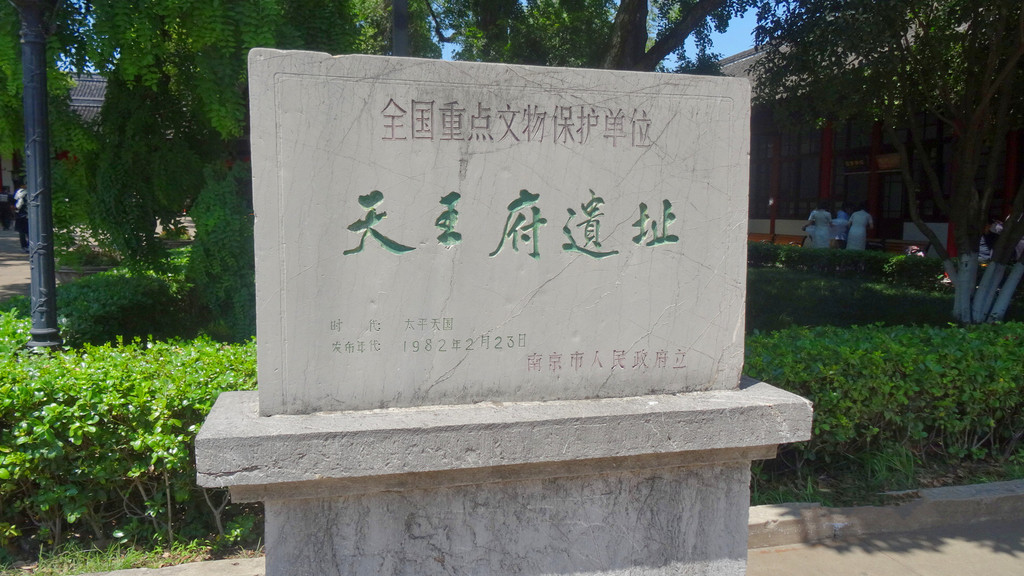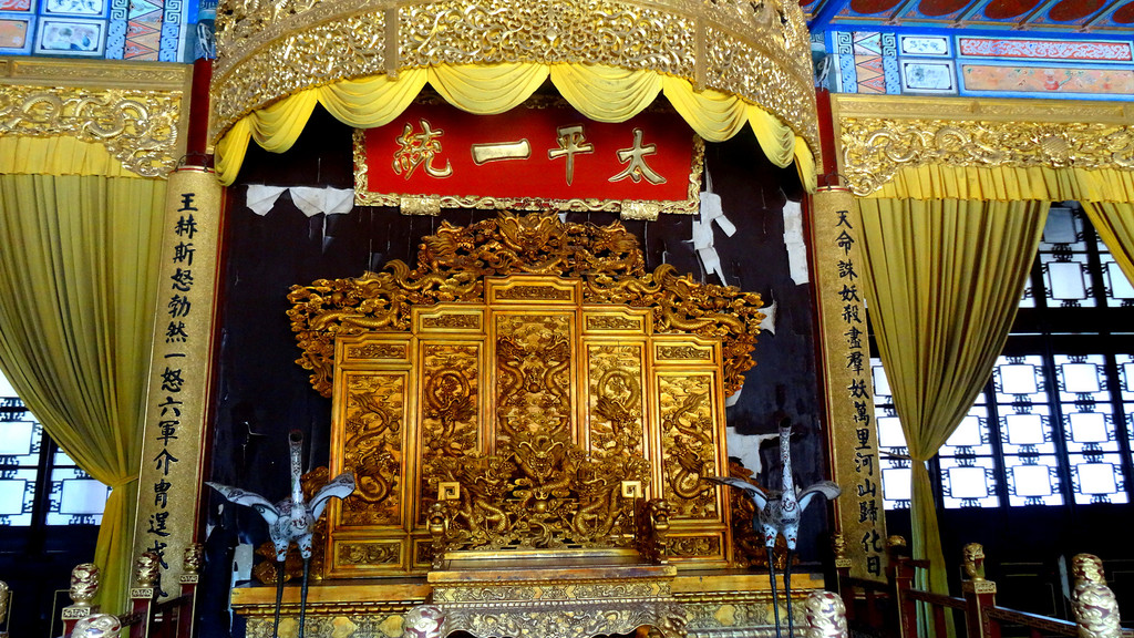 天王宝座,再现了天朝宫殿的昔日辉煌,室内还展览陈列了一些文物图片资料,反映了太平天国在天京的一些历史事件,在内容上体现了"三天"即天王、天京、天朝宫殿的特色。