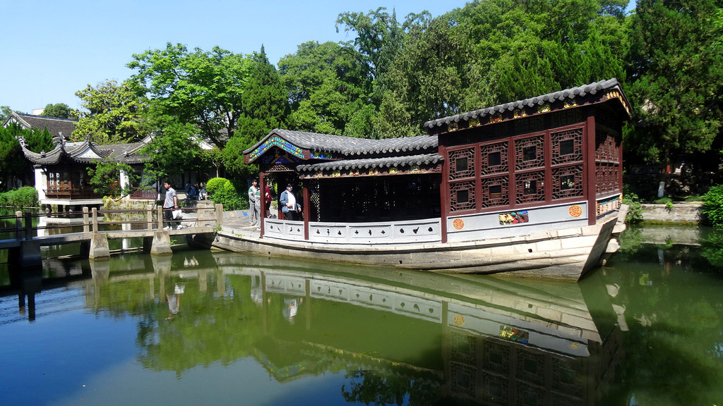 石舫。又名不系舟,位于煦园南侧,立于水光涟漪的太平湖中,“泛若不系之舟,虚而遨游者也”。1746年,时任清两江总督尹继善为迎接乾隆帝二下江南建造此石舫。