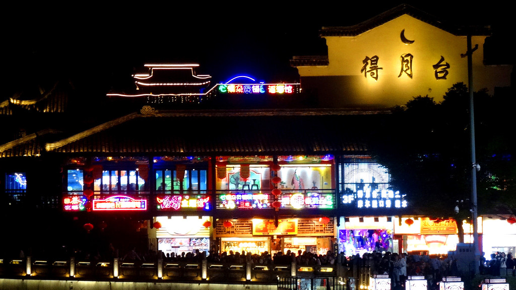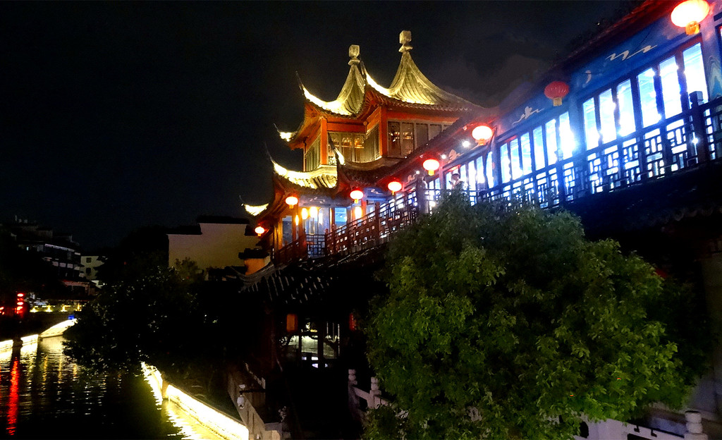 美好的时光总是过的快,不知不觉一个多小时流逝在这回味惬意繁华中,回到了出发点,转眼又看到得月台,再次回到秦淮人家的臂弯里,几近晚上十一点,登临游船的人渐渐少了,再次回到岸上,回望那船那水那栏杆,是留恋是赞叹是心中的挽。