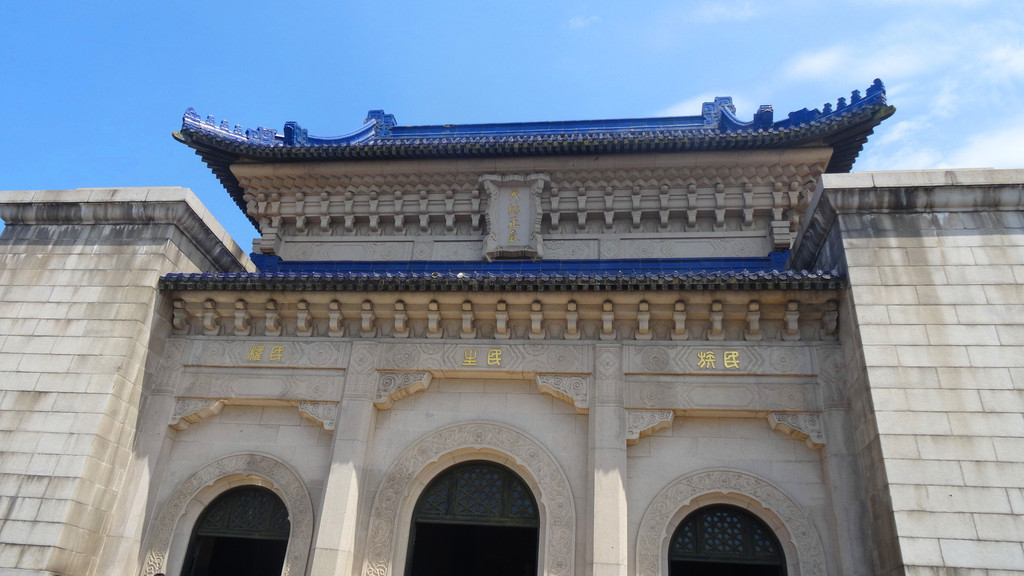 陵门的屋顶为单檐歇山式,上覆蓝色琉璃瓦。陵门有三个拱门,中间大,两边小,中间门关,右边上行,左边下行。正门的上方,镶有一方石额,上刻“天下为公”四个镏金大字。这是孙中山先生的手书,端庄朴实,雄迈俊逸,体现先生追求革命的境界。