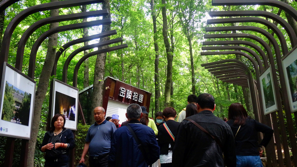 中山陵位于江苏省南京市玄武区紫金山南麓钟山风景区内,前临平川,背拥青嶂,东毗灵谷寺,西邻明孝陵,整个建筑群依山势而建,由南往北沿中轴线逐渐升高,随着人流由南向北,路途平缓,道路两边悬挂着“金陵拾趣”----南京的风土人情、经济发展、旅游风景等的摄影展长廊,在绿荫下一边走路,一边初步认识南京的方方面面的确是不错的体验。