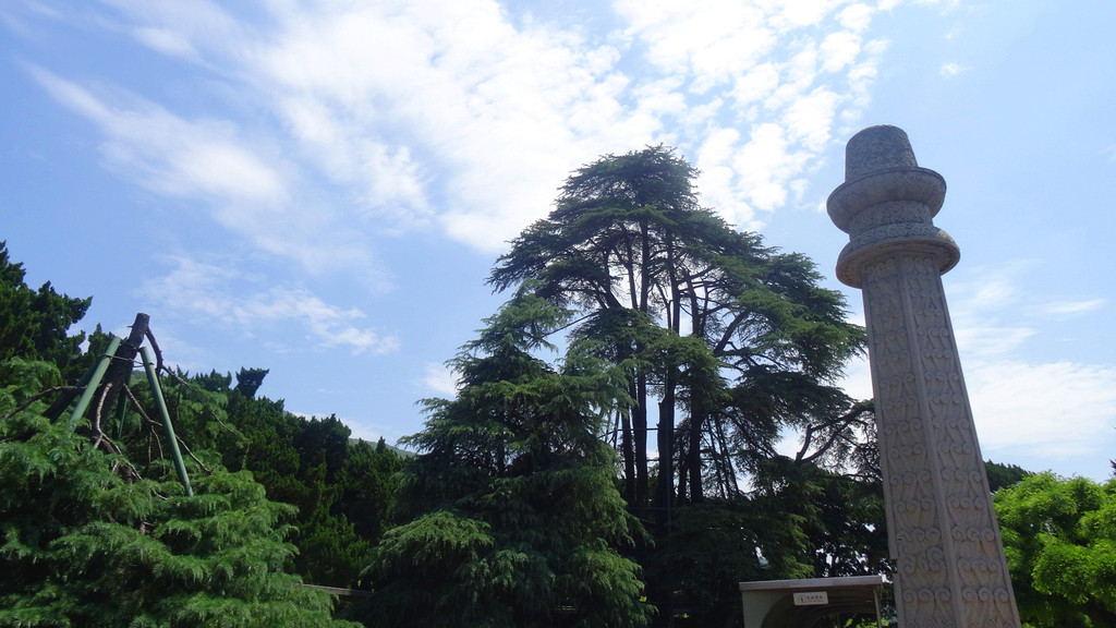 陵门。陵门建筑在中山陵中轴线上的正中,门前是一块宽阔的水泥平台,能容纳一万多人。平台两侧是绒毯般的草坪。在左右草坪上,互相对称的十棵四季长青的黄杨球,还有六株名贵的千头松,其状如伞,异常优美。
