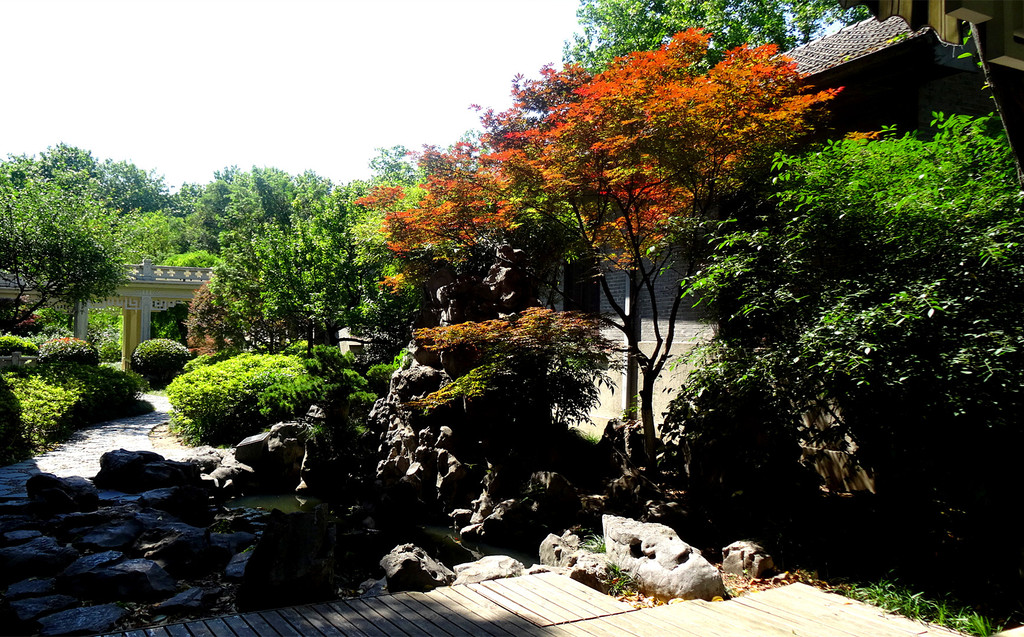 煦园(西花园)明朝初年为汉王府花园,以汉王朱高煦名中的"煦"字而得名。清朝为两江总督署花园。太平天国建天朝宫殿时予以扩建。因花园位于宫殿西侧,又称"西花园",与东花园相对称。清军破城时被毁,曾国藩予以重建。煦园为典型的江南园林,与总统府连为一体。至今还保留有诸多著名的遗址景点,如石舫、夕佳楼、忘飞阁、漪澜阁、印心石屋等。